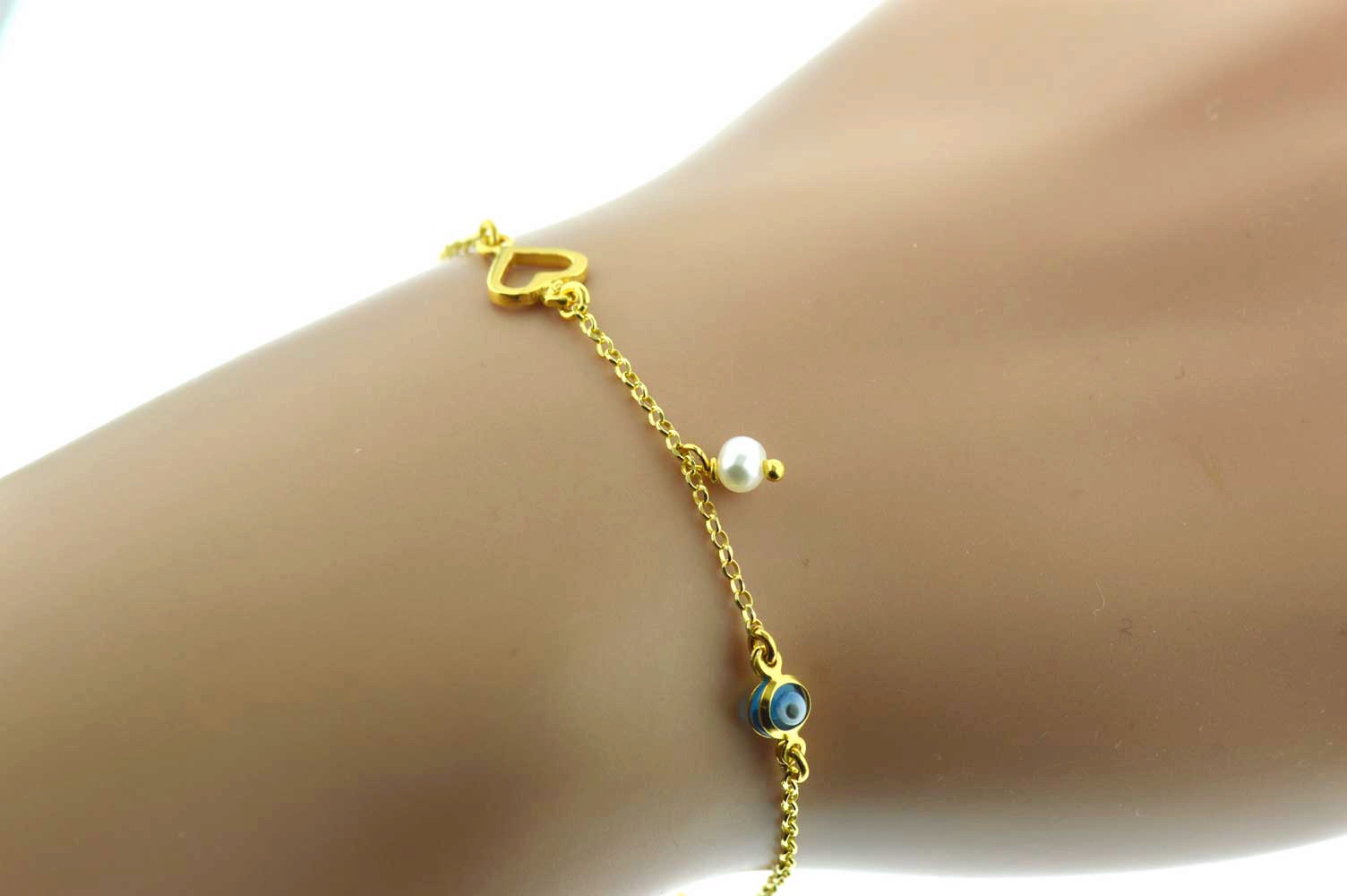Βραχιόλι σε χρυσό με καρδούλα, πέρλα και μάτι από ασήμι 925°