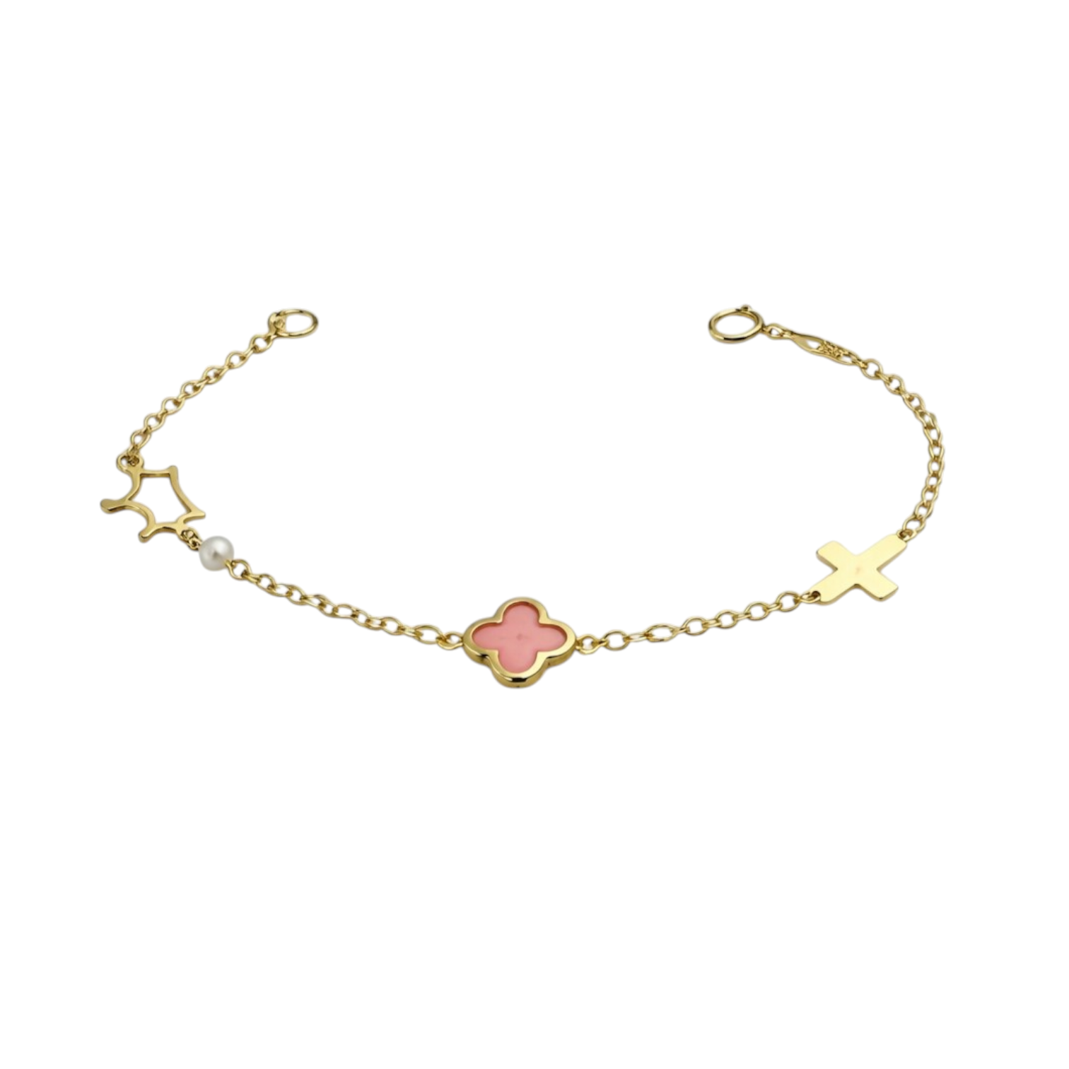 Βραχιόλι χρυσό με κορώνα σταυρό και μαργαριτάρια σε Κ9