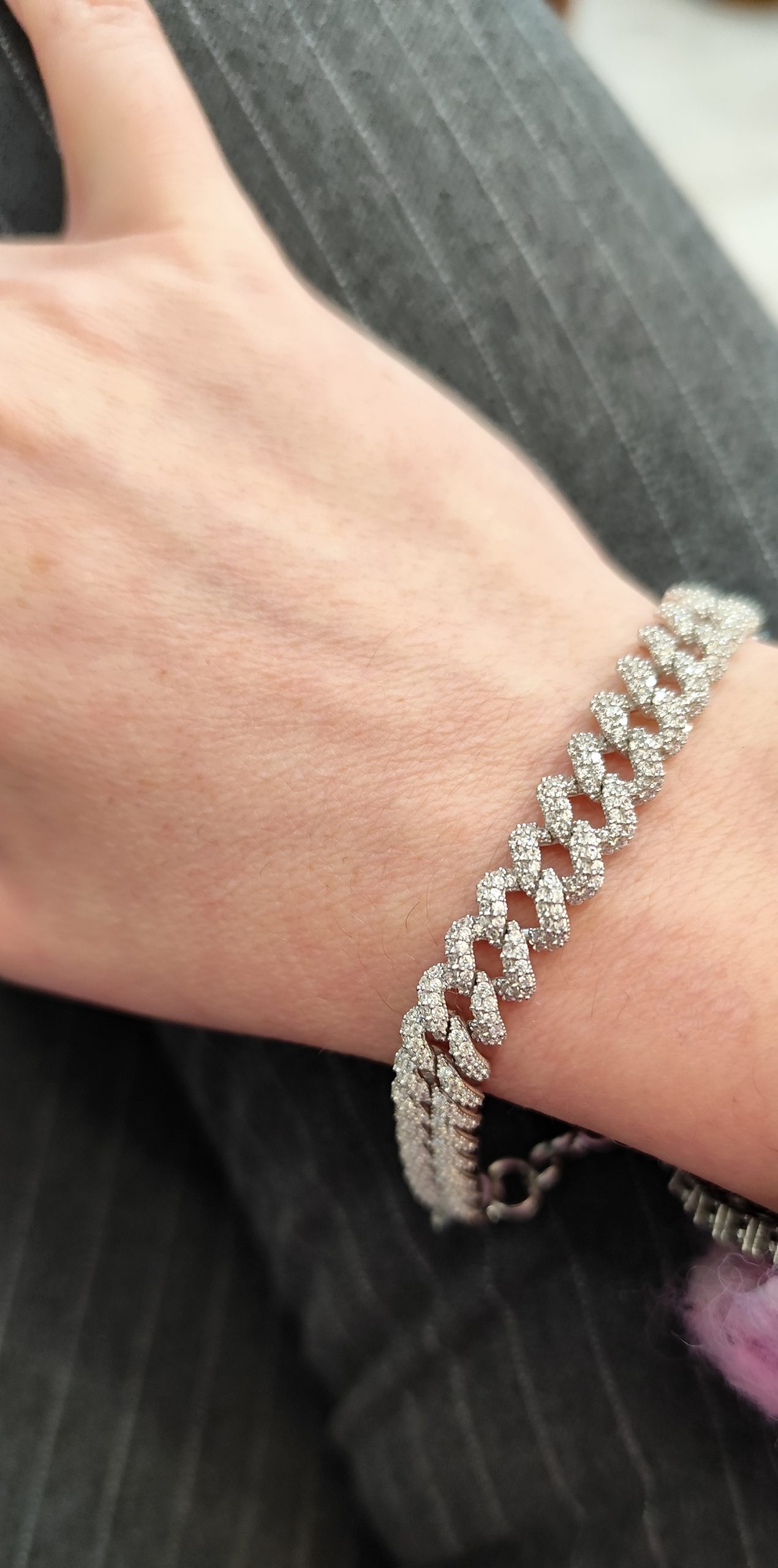 Μία εντυπωσιακή αλυσίδα-βραχιόλι , κατασκευασμένο από ασήμι 925° σε λευκό χρώμα αποτελούμενο από πέτρες ζιργκόν σε λευκό χρώμα. Μήκος βραχιολιού 17-19,5εκ με κούμπωμα ασφαλείας. Ένα διαχρονικό κόσμημα που θα σας συντροφεύει παντού!