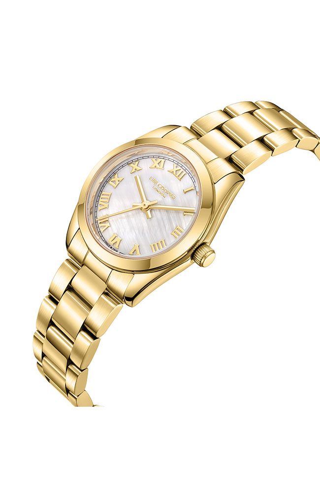 Γυναικείο ρολόι Lee Cooper χρυσό με χρυσούς δείκτες,με φίλντισι και λατινικούς αριθμούς στο καντράν , η κάσα του οποίου είναι κατασκευασμένη από ένα πολύ ανθεκτικό κράμα μετάλλων τετραπλής επίστρωσης που ονομάζεται Supermetal ,ένα πολύ κομψό γυναικείο ρολόι.