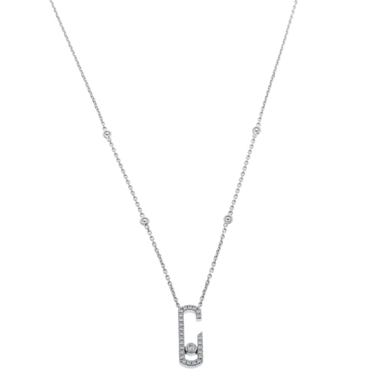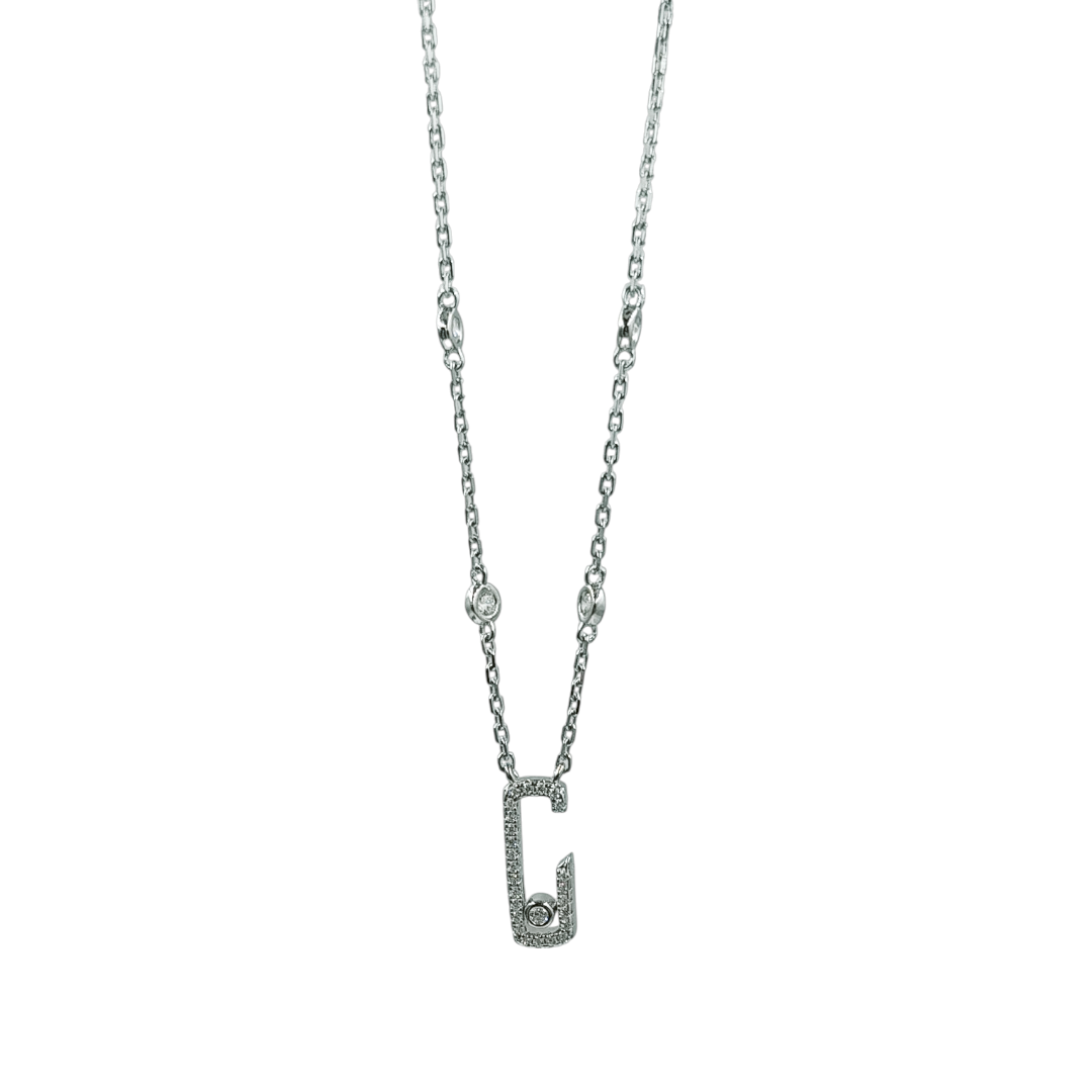 Κολιέ από ασήμι 925° με οβάλ στοιχείο κρεμαστό με ένα λευκό ζιργκόν στο εσωτερικό του. Μήκος αλυσίδας: 44,5εκ με κρίκο στα 40εκ