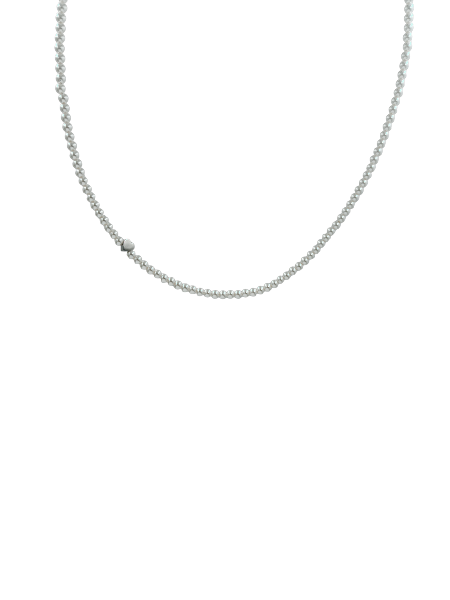 Γυναικείο κολιέ με λευκές φυσικές πέρλες και ασημένια διακριτική καρδούλα ενδιάμεσα από ασήμι 925°. Ένα διακριτικό κόσμημα που θα σας συνοδεύει καθημερινά.