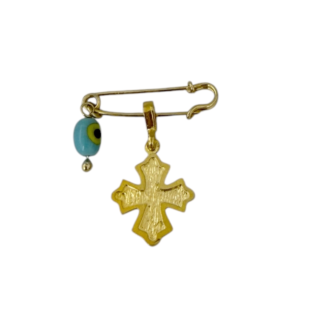 Παραμάνα με κρεμαστό σταυρό στην μια όψη με γαλάζιο ζιργκόν στο κέντρο και κρεμαστό γαλάζιο ματάκι, από ασήμι 925° . Ένα ιδανικό κόσμημα-φυλαχτό για νεογέννητο μωρό.