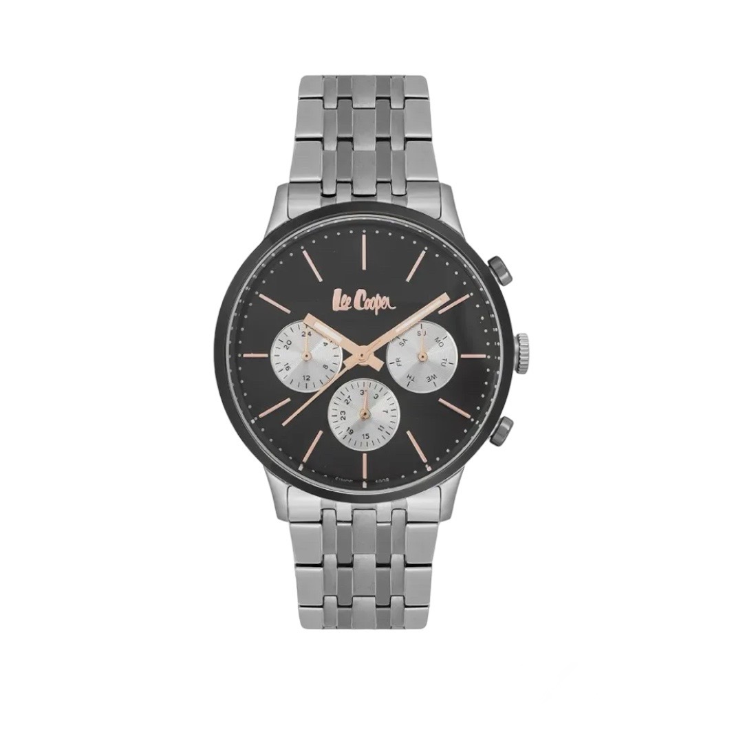 Ανδρικό ρολόι Lee Cooper με μαύρο καντράν και ασημένιες λεπτομέρειες η κάσα του οποίου είναι κατασκευασμένη από ένα πολύ ανθεκτικό κράμα μετάλλων τετραπλής επίστρωσης που ονομάζεται Supermetal και μπρασελέ  μεταλλικό ,ένα πολύ κομψό ανδρικό ρολόι.