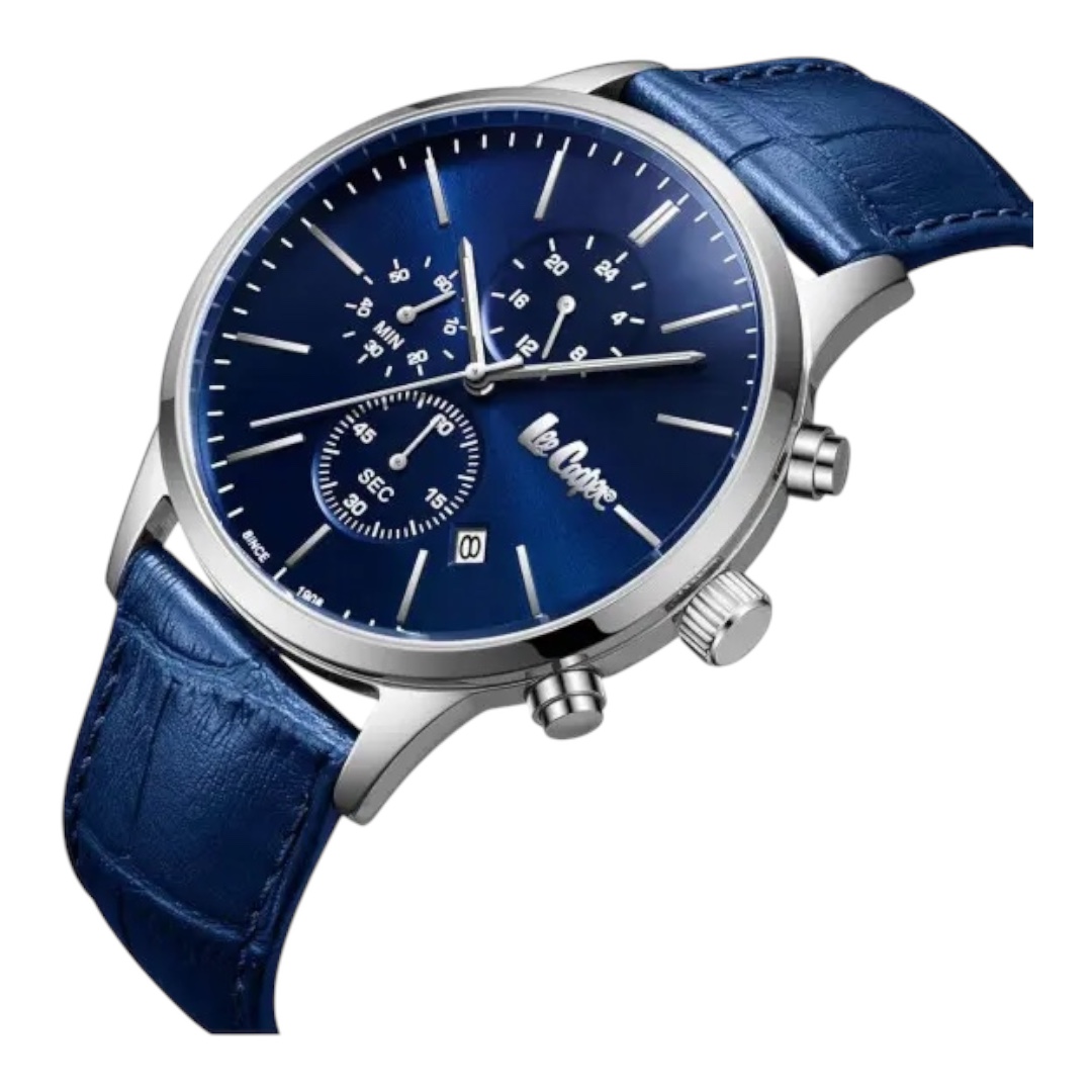 Ανδρικό ρολόι Lee Cooper με μπλε καντράν η κάσα του οποίου είναι κατασκευασμένη από ένα πολύ ανθεκτικό κράμα μετάλλων τετραπλής επίστρωσης που ονομάζεται Supermetal και μπλε δερμάτινο λουρί ,ένα πολύ κομψό ανδρικό ρολόι.