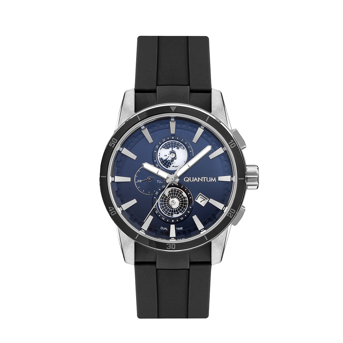 Ένα εντυπωσιακό ρολόι με μαύρο λουρί από καουτσούκ, μπλε καντράν σε μαύρη κάσα, ασημί στα σημεία και χρονογράφους που θα κλέψει τις καρδιές όσων το αποκτήσουν ,ένα ιδανικό αντρικό δώρο.
