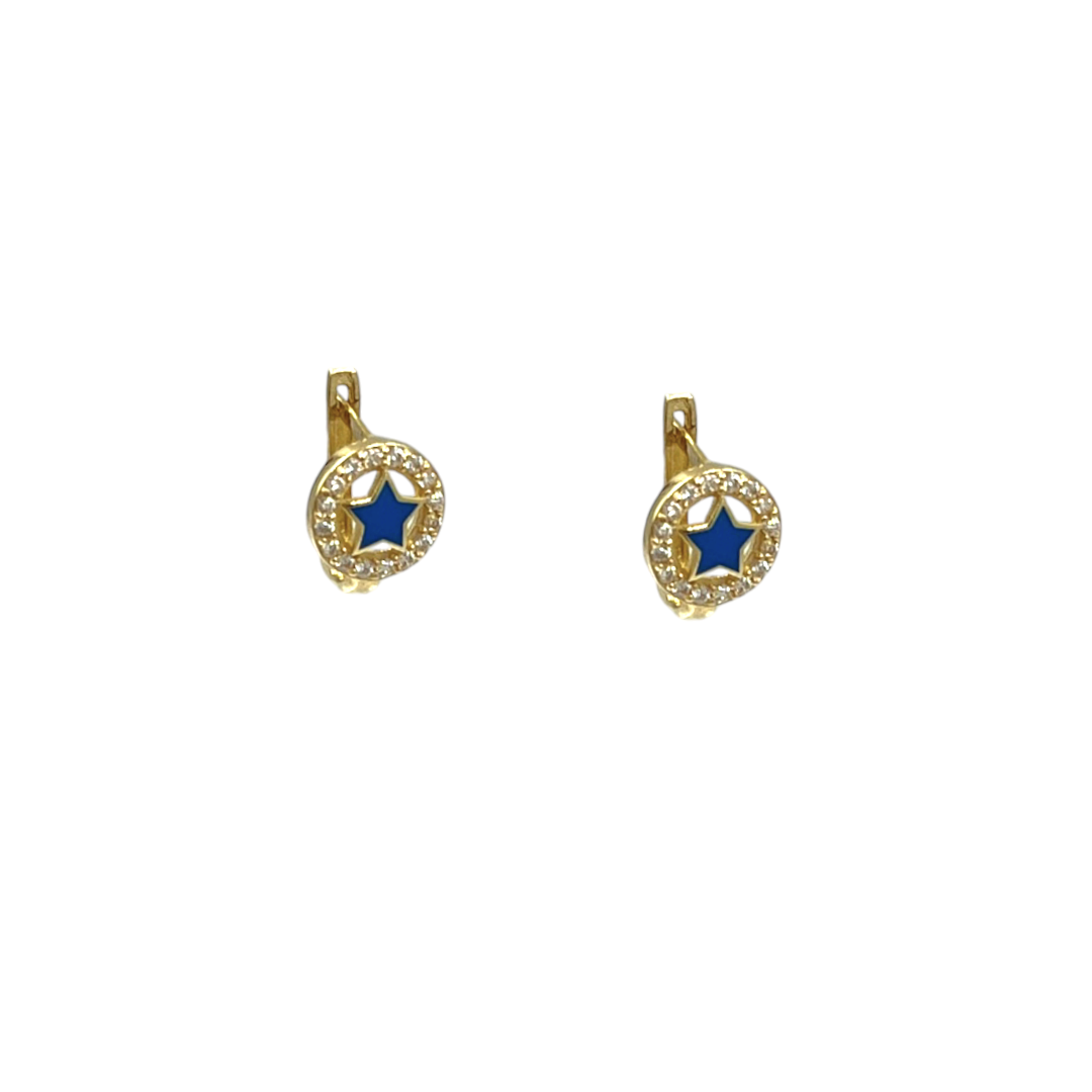 Χρυσά σκουλαρίκια ,κρεμαστά,14 καράτια σε σχέδιο στρογγυλό με αστεράκι από μπλε σμάλτο και λευκά ζιργκόν περιμετρικά. Ένα κόσμημα που θα αγαπήσουν τα παιδιά.