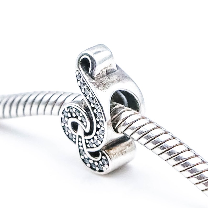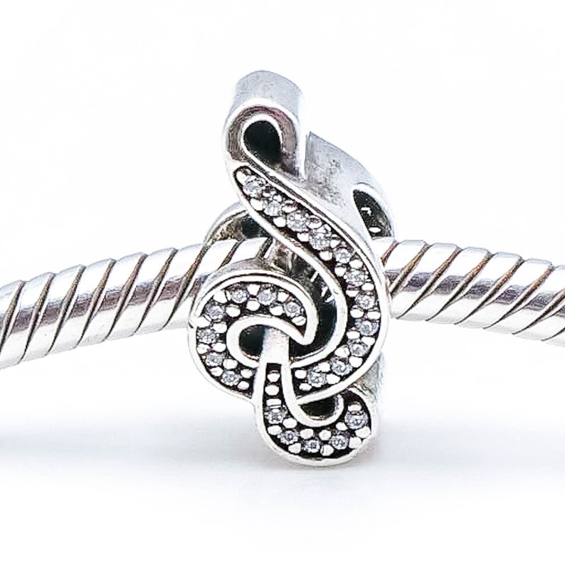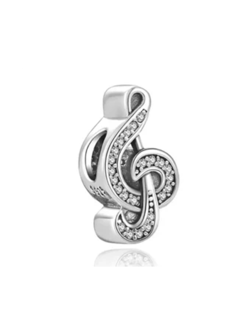 Charm σύμβολο για βραχιόλι από επιπλατινωμένο ασήμι 925° σε σχήμα κλειδί του σολ διακοσμημένο με λευκές πέτρες ζιργκόν. Ένα σύμβολο που σε συνδυασμό με το βραχιόλι, σας δίνει την ευκαιρία να δημιουργήσετε ένα μοναδικό και προσωπικό σύνολο και θα σας κάνει να ξεχωρίζετε. Συμβατό σε βραχιόλι Pandora