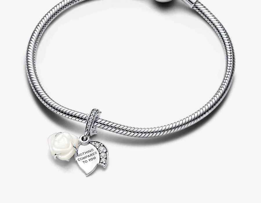 Charm για βραχιόλι σύμβολο διπλό κρεμαστό σύμβολο με το λευκό ανθισμένο τριαντάφυλλο, ένα κομμάτι από ασήμι 925 . Το σύμβολο περιλαμβάνει ένα τριαντάφυλλο από λευκό χρώμα με πέταλα σε στρώσεις . Διακοσμημένο με πέτρες από ζιργκόν. Το μήνυμα «NOTHING COMPARES TO YOU» προσθέτει μια προσωπική πινελιά. Ένα σύμβολο που σε συνδυασμό με το βραχιόλι, σας δίνει την ευκαιρία να δημιουργήσετε ένα μοναδικό και προσωπικό σύνολο και θα σας κάνει να ξεχωρίζετε. Συμβατό σε βραχιόλι Pandora