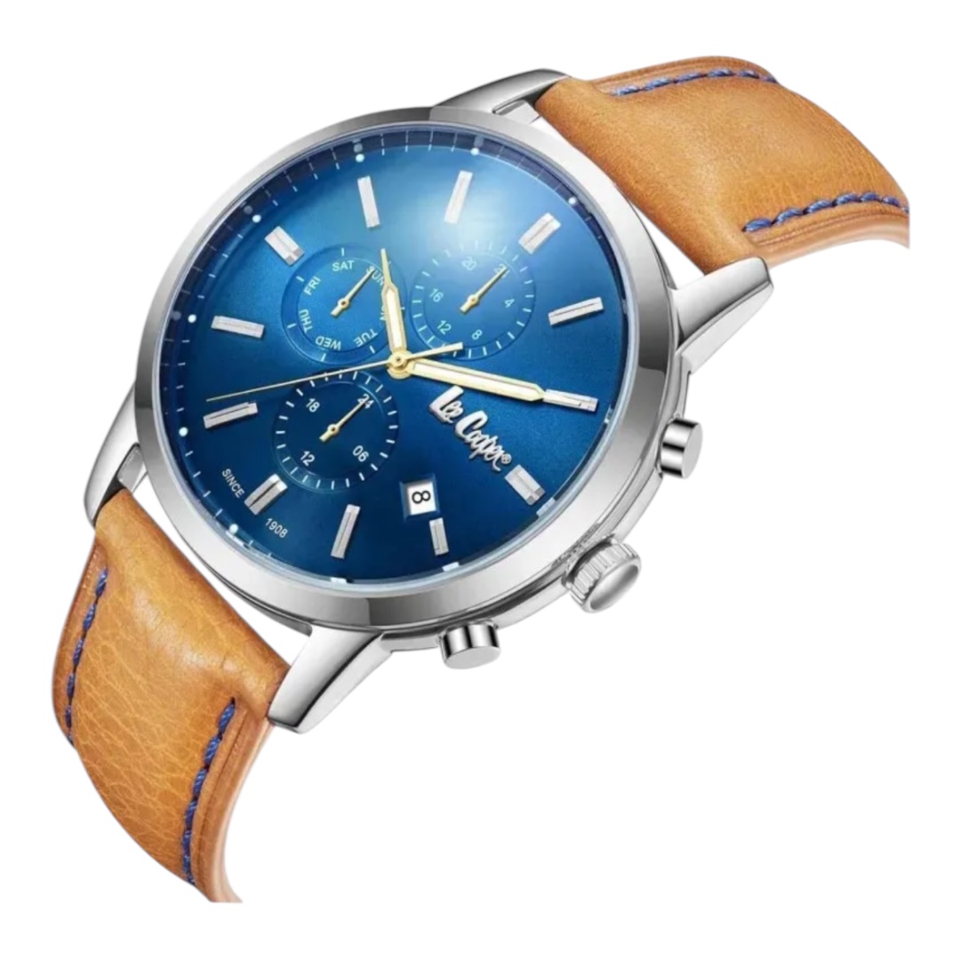 Ένα ανδρικό ρολόι της Lee Cooper με μεταλλικό πλαίσιο και δερμάτινο λουρί. Διαθέτει μεταλλικές λεπτομέρειες στο κατράν, ένδειξη ημέρας, ημερομηνίας και 24ώρου.