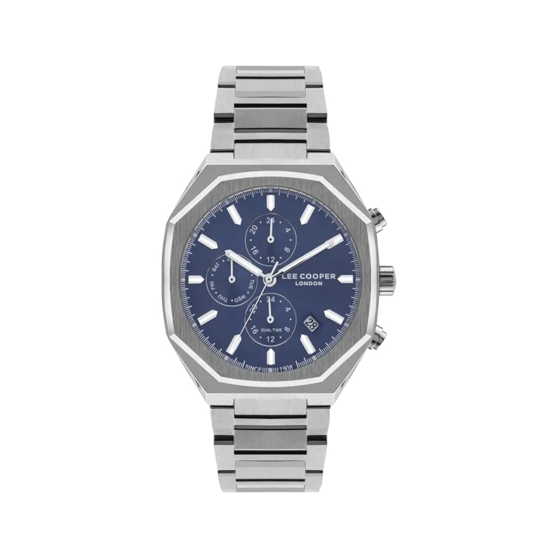 Ανδρικό ρολόι Lee Cooper με μπλε καντράν και ασημένιες λεπτομέρειες η κάσα του οποίου είναι κατασκευασμένη από ένα πολύ ανθεκτικό κράμα μετάλλων τετραπλής επίστρωσης που ονομάζεται Supermetal και μπρασελέ μεταλλικό ,ένα πολύ κομψό ανδρικό ρολόι.