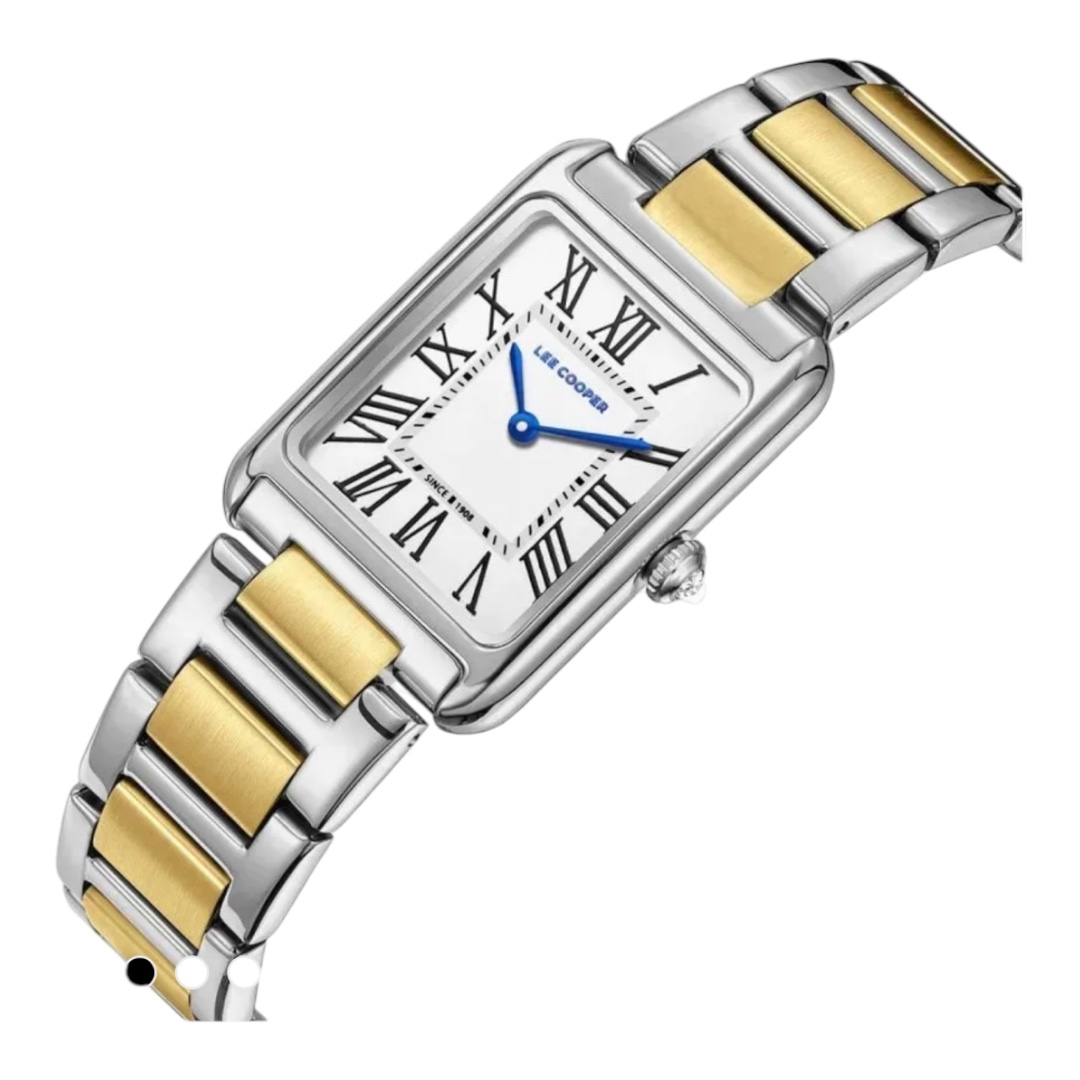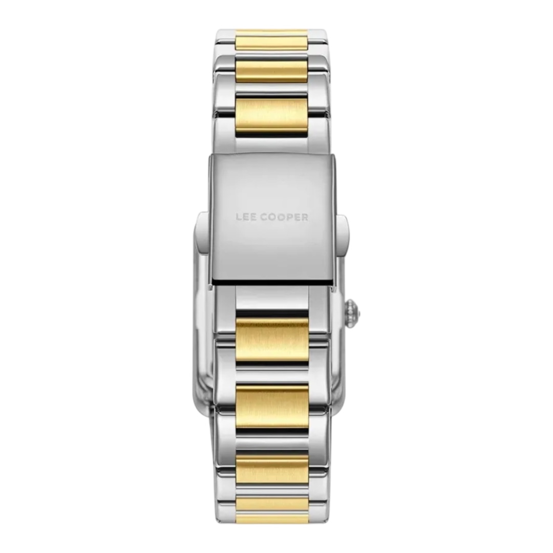 Γυναικείο ρολόι Lee Cooper ορθογώνιο με λευκό στο καντράν, λατινικούς χαρακτήρες στα σημεία και δίχρωμο μπρασελέ, η κάσα του οποίου είναι κατασκευασμένη από ένα πολύ ανθεκτικό κράμα μετάλλων τετραπλής επίστρωσης που ονομάζεται Supermetal ,ένα πολύ κομψό γυναικείο ρολόι.