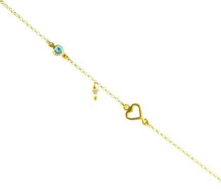 Βραχιόλι σε χρυσό με καρδούλα, πέρλα και μάτι από ασήμι 925°