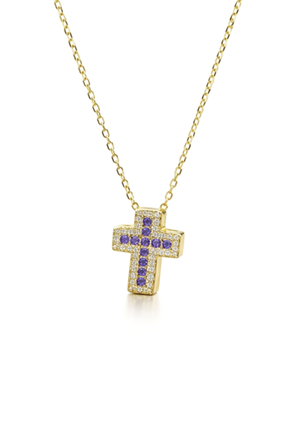 Κολιέ χρυσό με σταυρό με μωβ πέτρες από ασήμι 925°