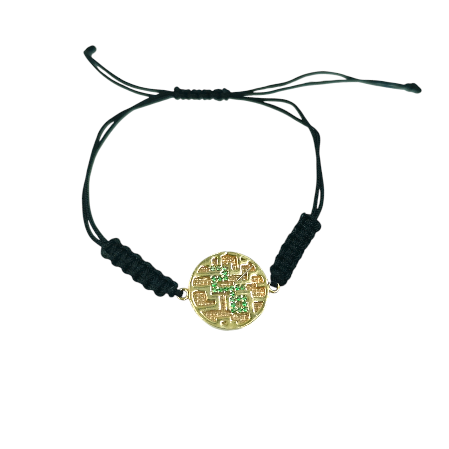 Βραχιόλι γούρι 2026 με στρογγυλό στοιχείο με το 26 με πράσινες πέτρες ζιργκόν από μαύρο μακραμέ. Το δέσιμο του μακραμέ δίνει την δυνατότητα να προσαρμόζεται το βραχιόλι σε όλους τους καρπούς