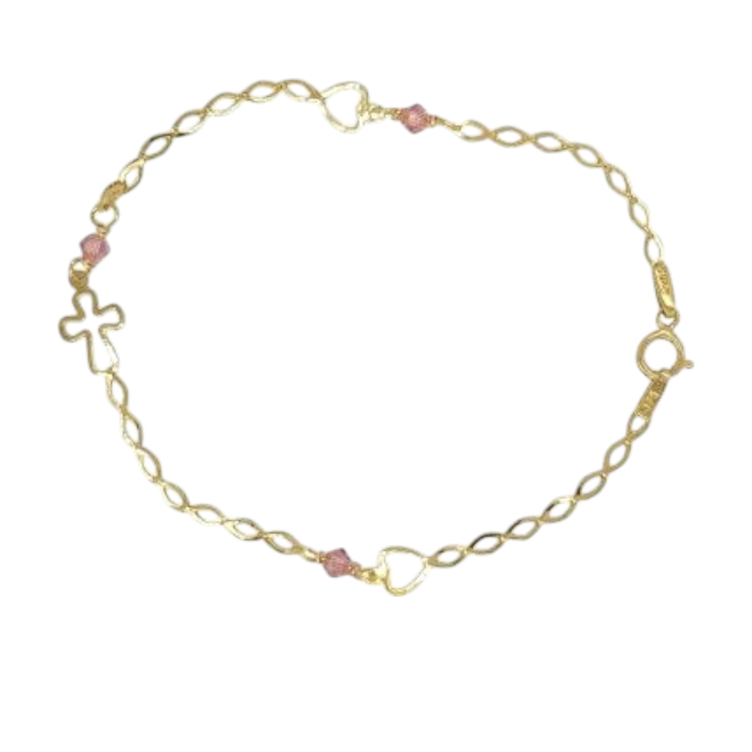 Παιδικό βραχιόλι από χρυσό 9 καράτια 375° με διάτρητο σταυρό, ροζ χάντρες και διάτρητες καρδιές. Ένα κόσμημα ιδανικό για κορίτσι.