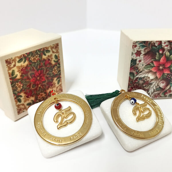 Μοντέρνο χειροποίητο γούρι μάρμαρο με μεταλλικό στοιχείο στεφάνι από επιχρυσωμένο 24Κ κράμα μετάλλου διακοσμημένο με ευχές και στο κέντρο κρεμαστό στοιχείο 25 με κόκκινη φούντα, για να υποδεχθείτε το νέο έτος!