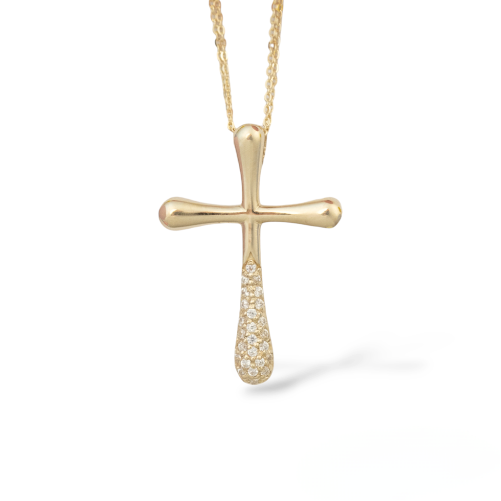 Γυναικείος σταυρός Val’oro χρυσός σε Κ14 σε ιδιαίτερο σχέδιο και με λευκές πέτρες ζιργκόν στο κάτω μέρος με διπλή αλυσίδα. Μια εξαιρετική επιλογή για βάπτιση ή γυναικείο δώρο.
