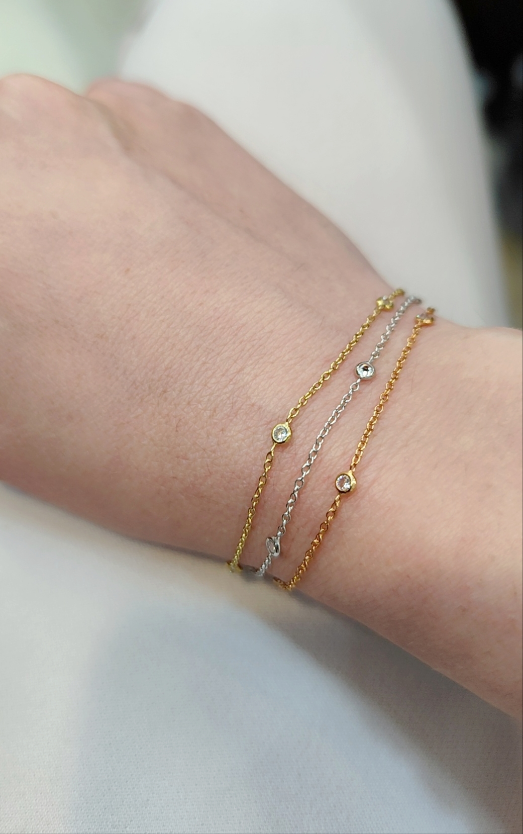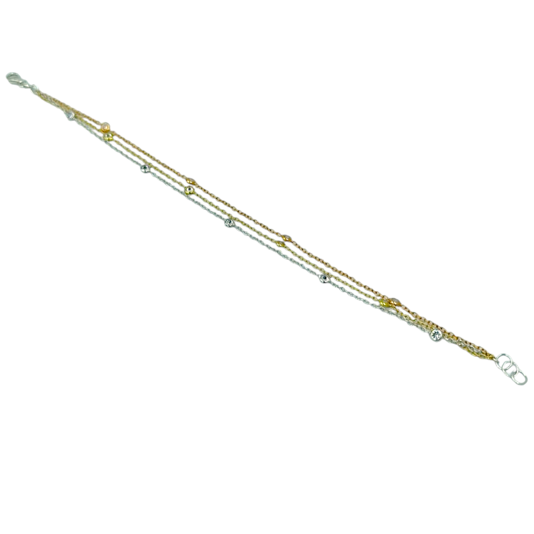 Χρυσό βραχιόλι με τρεις αλυσίδες στα τρία χρώματα του χρυσού και στολισμένο με λευκές πέτρες ζιργκόν,σε 14 καράτια. Ένα κόσμημα που θα σας συνοδεύει καθημερινά αλλά και για ξεχωριστές εμφανίσεις.