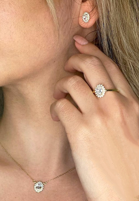 Χρυσό δαχτυλίδι από ασήμι 925° ροζέτα με λευκή κεντρική πέτρα και λευκά ζιργκόν περιμετρικά, εξαιρετική ποιότητα κατασκευής σε ένα διαχρονικό κόσμημα.