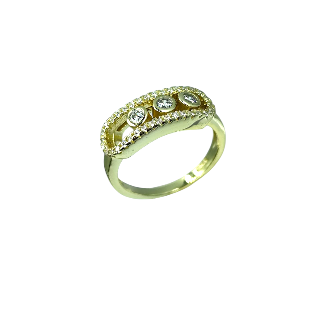 Δαχτυλίδι με τρία λευκά ζιργκόν στο κέντρο και περιμετρικά, επιχρυσωμένο από ασήμι 925°, εξαιρετική ποιότητα κατασκευής σε ένα  μοντέρνο κόσμημα.