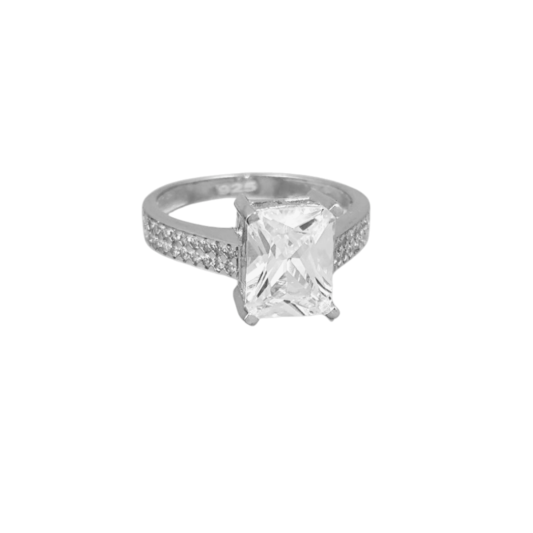 Δαχτυλίδι από επιπλατινωμένο ασήμι 925° με ημιπολύτιμες πέτρες (ζιργκόν) στο πλάι και κεντρική ορθογώνια στο κέντρο σε λευκό χρώμα.
