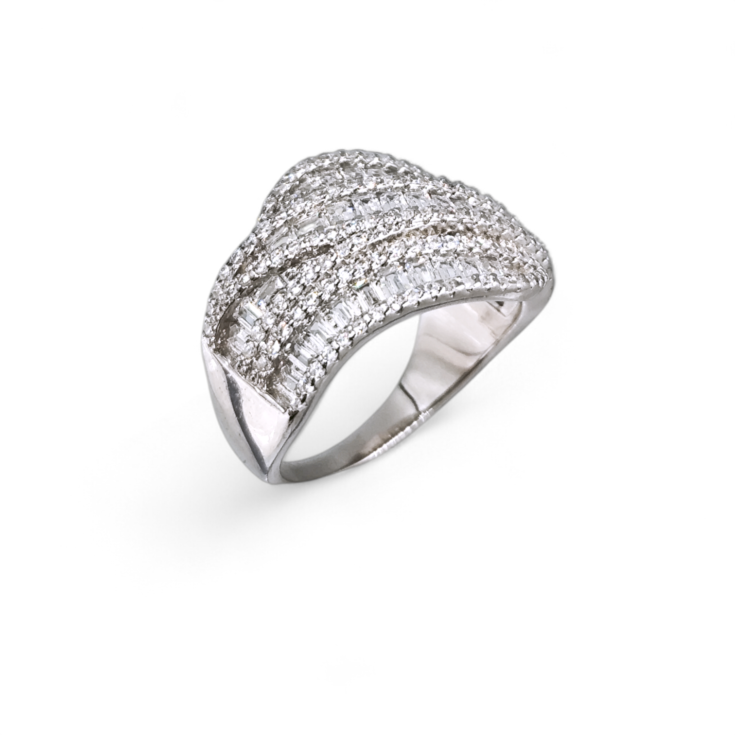 Εντυπωσιακό δαχτυλίδι με σχέδιο διακοσμημένο με λευκά ζιργκόν σε κοπή μπαβέτ αλλά και στρογγυλά από ασήμι 925°.