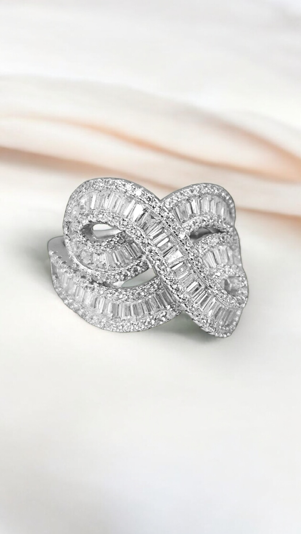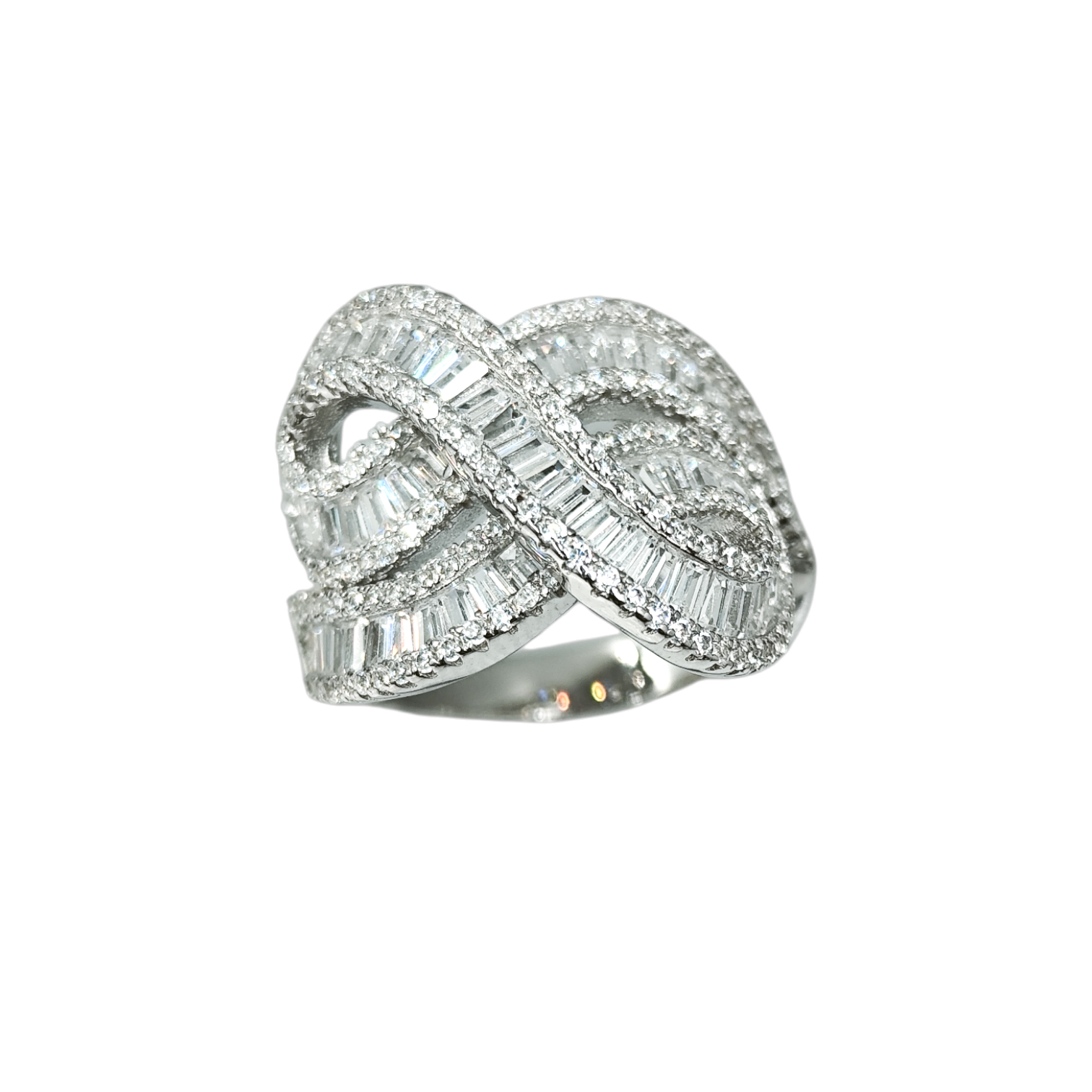 Εντυπωσιακό δαχτυλίδι με σχέδιο πλεκτό, διακοσμημένο με λευκά ζιργκόν σε κοπή μπαβέτ αλλά και στρογγυλά από ασήμι 925°.