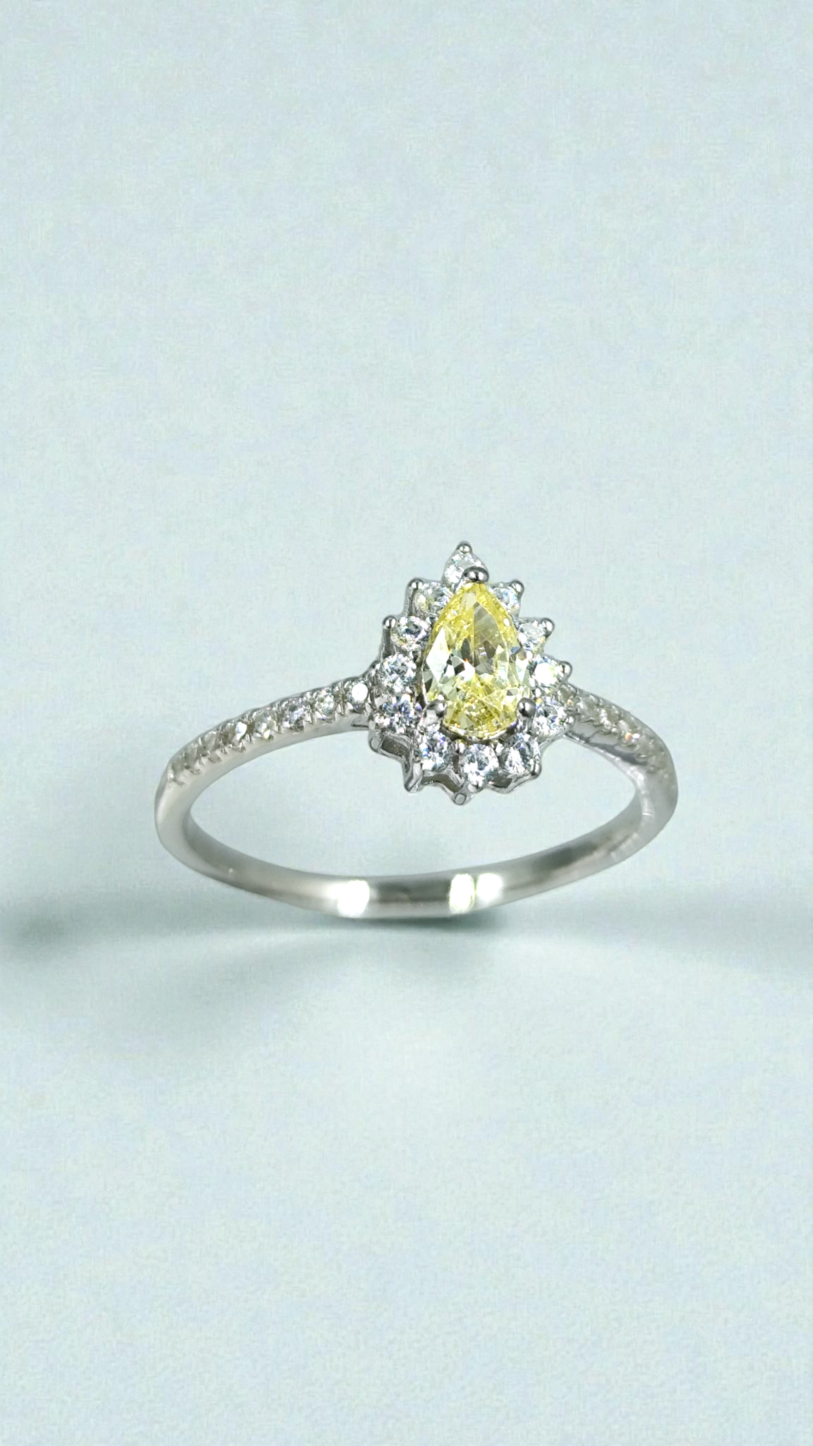 Ασημένιο δαχτυλίδι από ασήμι 925° ροζέτα σε σχήμα σταγόνα με κεντρική κίτρινη πέτρα και λευκά ζιργκόν περιμετρικά και στο πλάι, εξαιρετική ποιότητα κατασκευής σε ένα διαχρονικό κόσμημα.