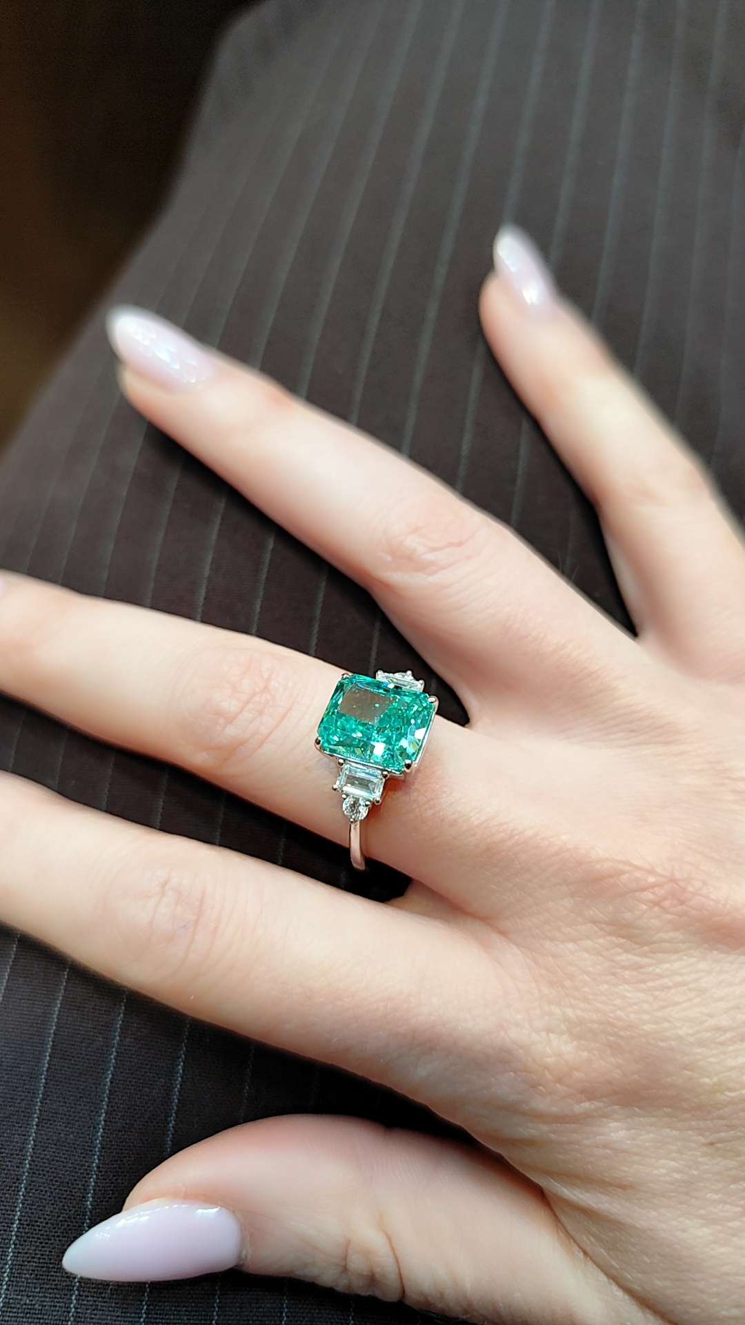 Δαχτυλίδι από ασήμι 925° με πέτρα σε ορθογώνιο σχήμα, χρώμα τουρμαλίνης paraiba και λευκά ζιργκόν στο πλάι, εξαιρετική ποιότητα κατασκευής σε ένα διαχρονικό κόσμημα.
