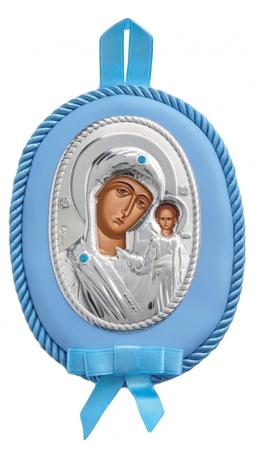 Φυλαχτό εικόνα κούνιας ασημένιο 925° από την Princelino, με την Παναγία Καζάν , σε γαλάζιο χρώμα και οβάλ σχήμα με μουσική, σε διαστάσεις 10 X 12εκ.