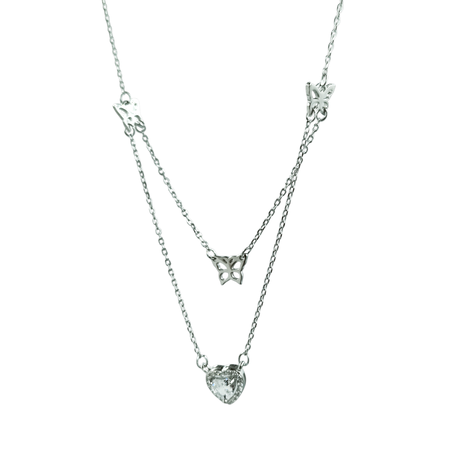 Κολιέ διπλό από ασήμι 925° με καρδιά και πεταλούδες