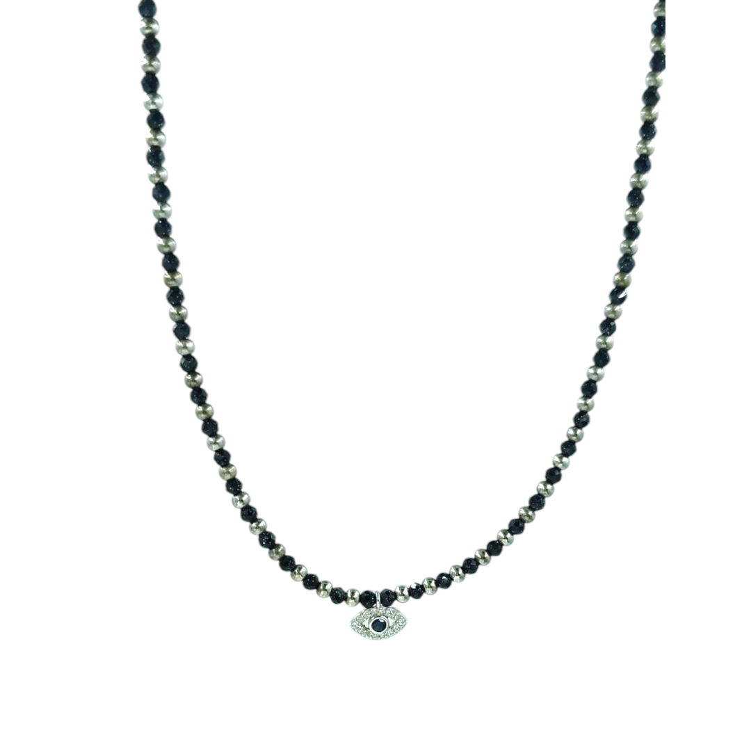 Κολιέ-ροζάριο, με μπλε πέτρες, μπίλιες ενδιάμεσα και κρεμαστό ματάκι με λευκές πέτρες, από ασήμι 925° , κομψό κόσμημα για καθημερινές και ξεχωριστές εμφανίσεις.