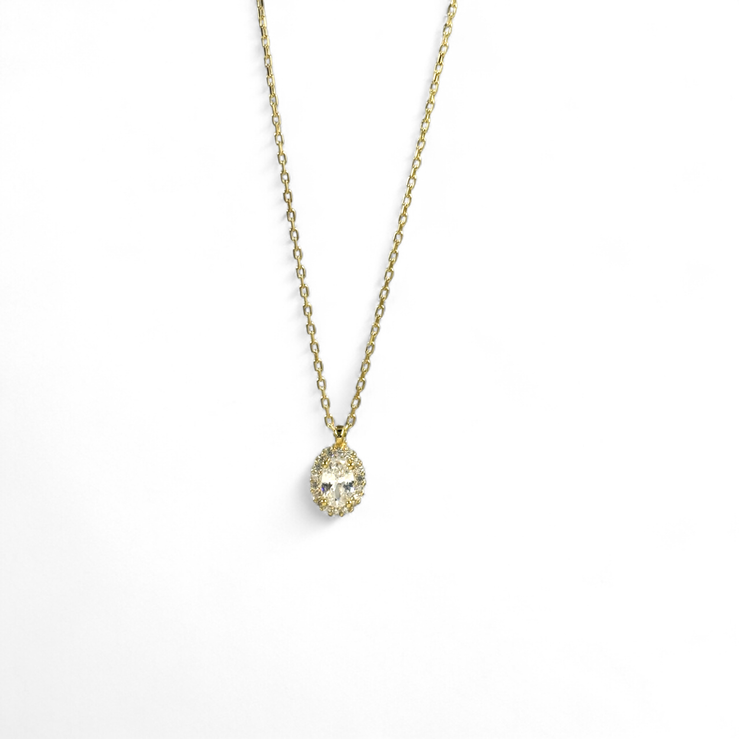 Κολιέ ροζέτα με λευκή οβάλ πέτρα στο κέντρο και λευκά ζιργκόν περιμετρικά από επιχρυσωμένο ασήμι 925°
