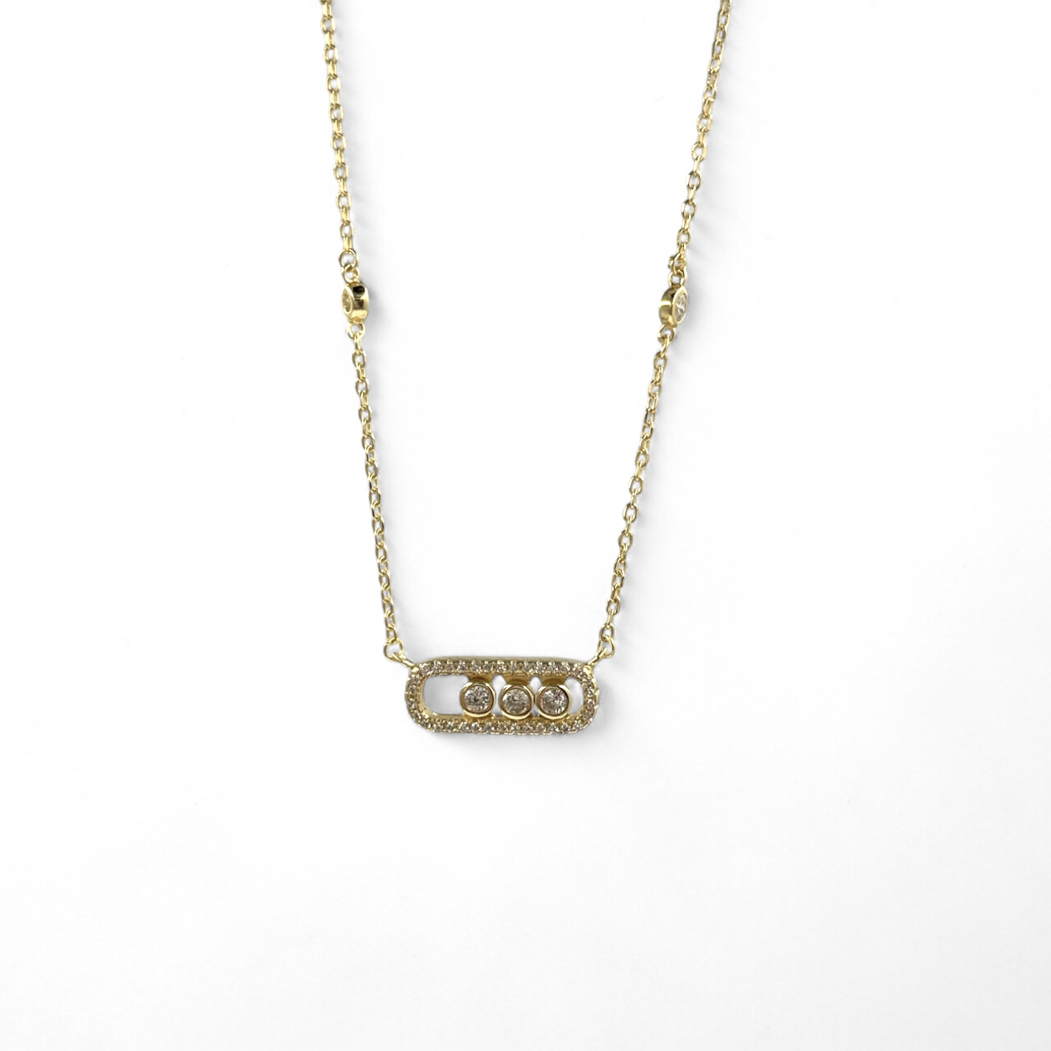 Κολιέ από επιχρυσωμένο  925° με οβάλ σχέδιο στο κέντρο, δύο μικρά στρογγυλά λευκά ζιργκόν δεξιά και αριστερά και μικρά λευκά ζιργκόν που μετακινούνται στο εσωτερικό. Μήκος αλυσίδας 41,5-45εκ. Ένα μοναδικό κόσμημα που θα σας συνοδεύει καθημερινά.