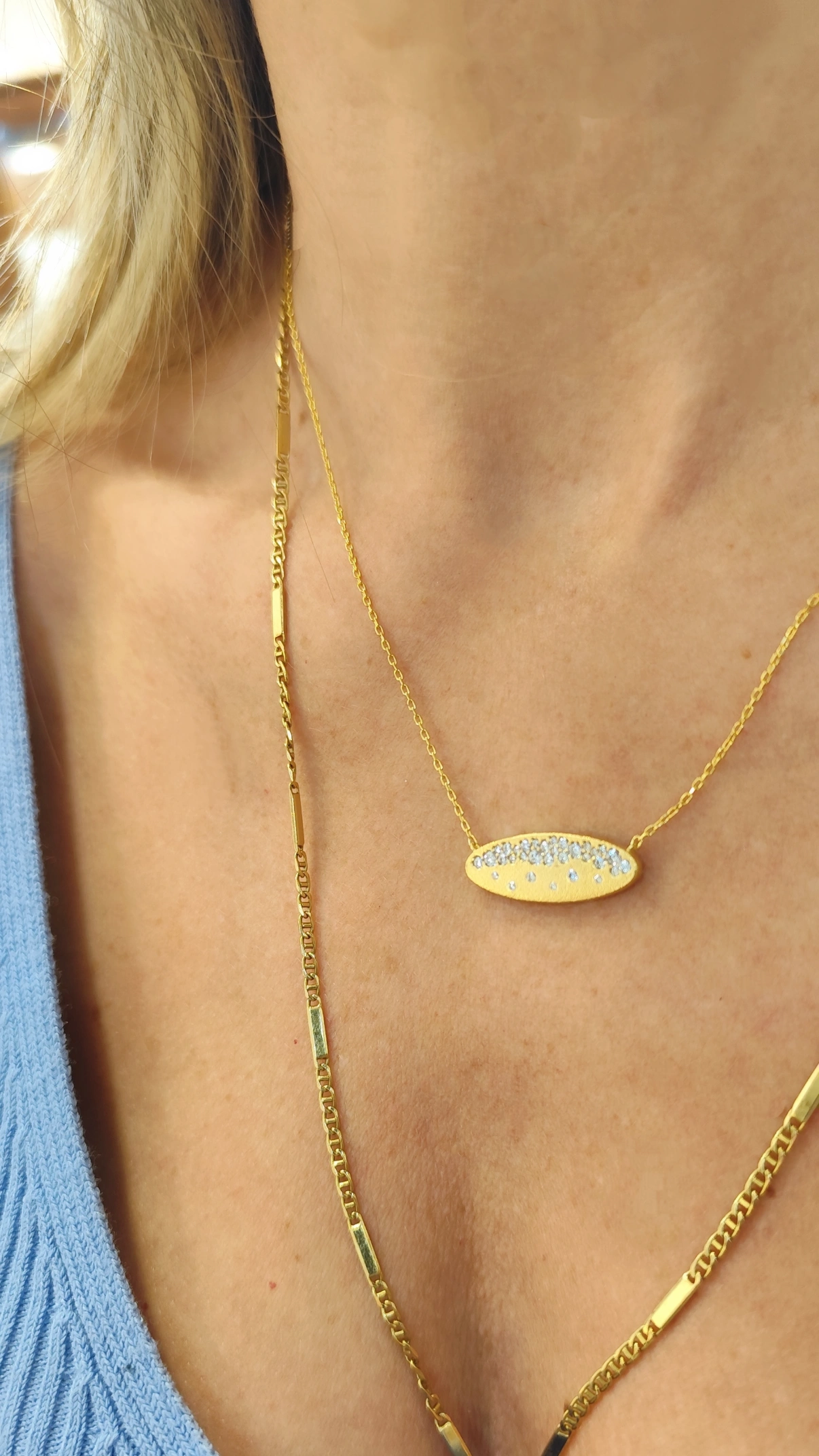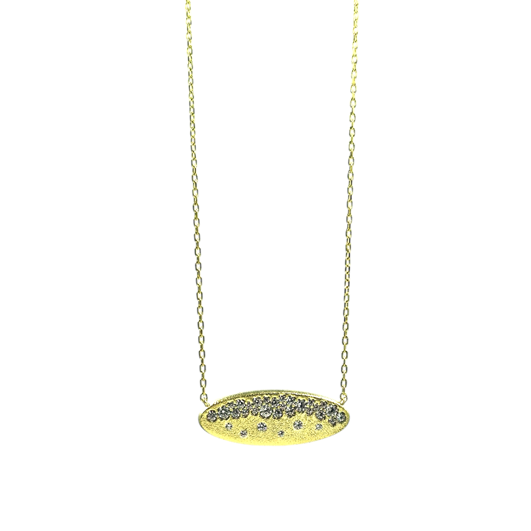 Κολιέ ασημένιο επιχρυσωμένο 925° με οβάλ σχέδιο και μικρά λευκά ζιργκόν. Μήκος αλυσίδας 40.5-45.5εκ. Ένα μοναδικό κόσμημα που θα σας συνοδεύει καθημερινά.