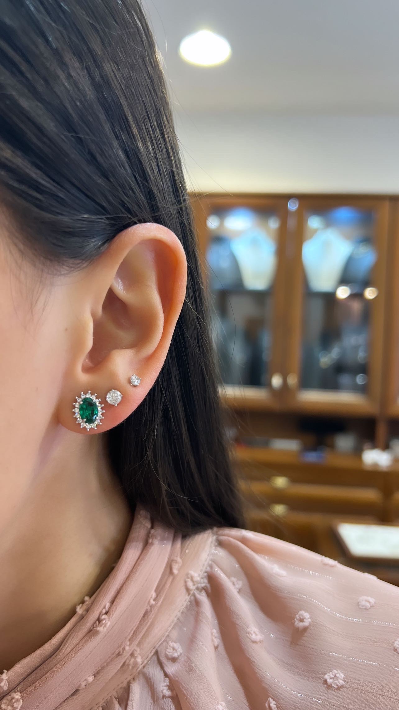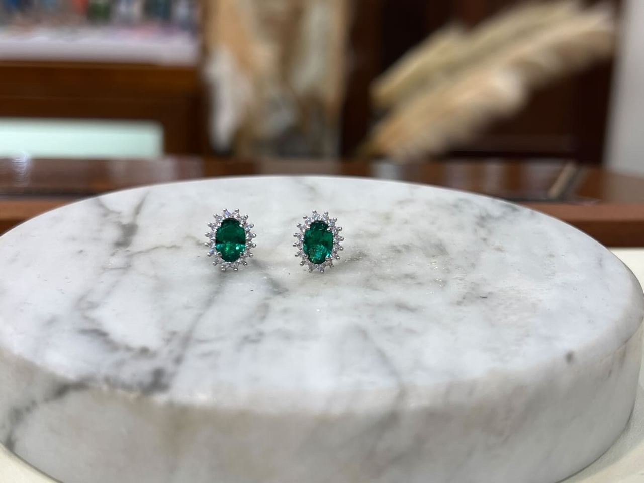 Λευκόχρυσα σκουλαρίκια 14 καράτια με πράσινη κεντρική πέτρα και λευκές περιμετρικά σε οβάλ σχήμα,ιδανικά για γυναικείο κόσμημα.