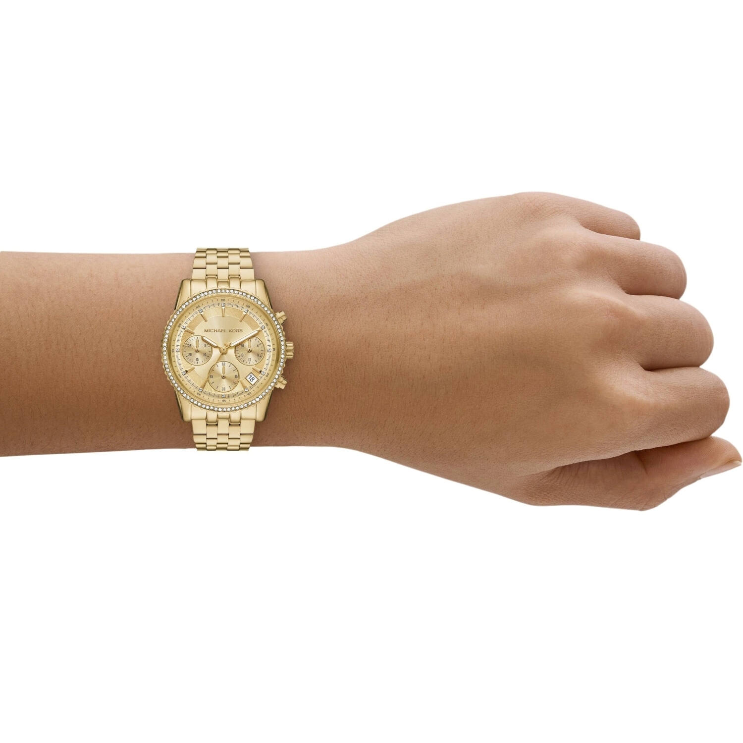 Γυναικείο ρολόι Michael Kors Ritz MK7530 χρονογράφος με χρυσό ατσάλινο μπρασελέ και χρυσό κάντραν διαμέτρου 34mm διακοσμημένο με ζιργκόν. Λειτουργεί με μηχανισμό μπαταρίας quartz, έχει ένδειξη ημερομηνίας και είναι αδιάβροχο με στεγανότητα 5ATM-50Μ.