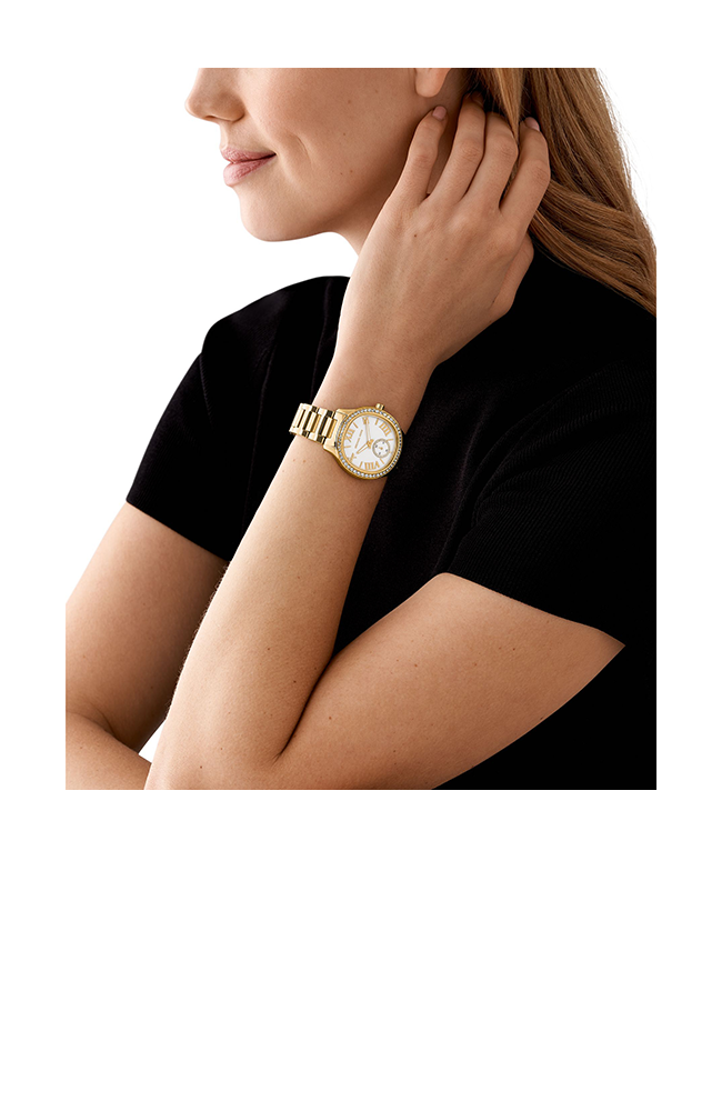 Από την αγαπημένη σειρά Sage ένα ρολόι με μοναδική φινέτσα , φίλντισι καντράν διακοσμημένο με λευκά ζιργκόν με χρυσά στοιχεία και επιχρυσωμένο ανοξείδωτο ατσάλι,  του οίκου Michael Kors.