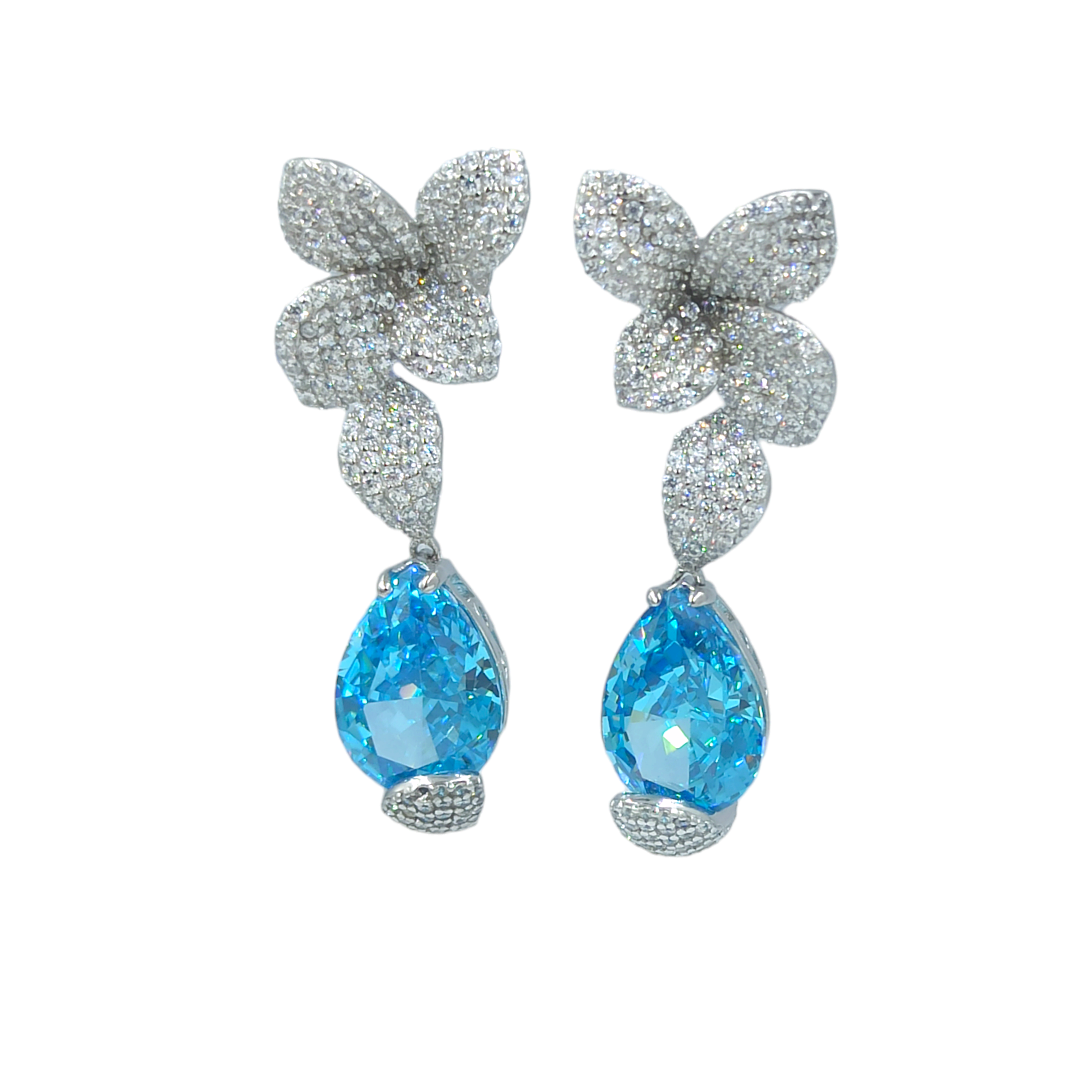 Κρεμαστά σκουλαρίκια εντυπωσιακά με σχέδιο λουλουδιού διακοσμημένο με μικρά λευκά ζιργκόν στο πάνω μέρος και μοναδική γαλάζια πέτρα στο κάτω μέρος σε σχήμα σταγόνας, από ασήμι 925°. Ένα μοναδικό κόσμημα που θα κλέψει τις εντυπώσεις.