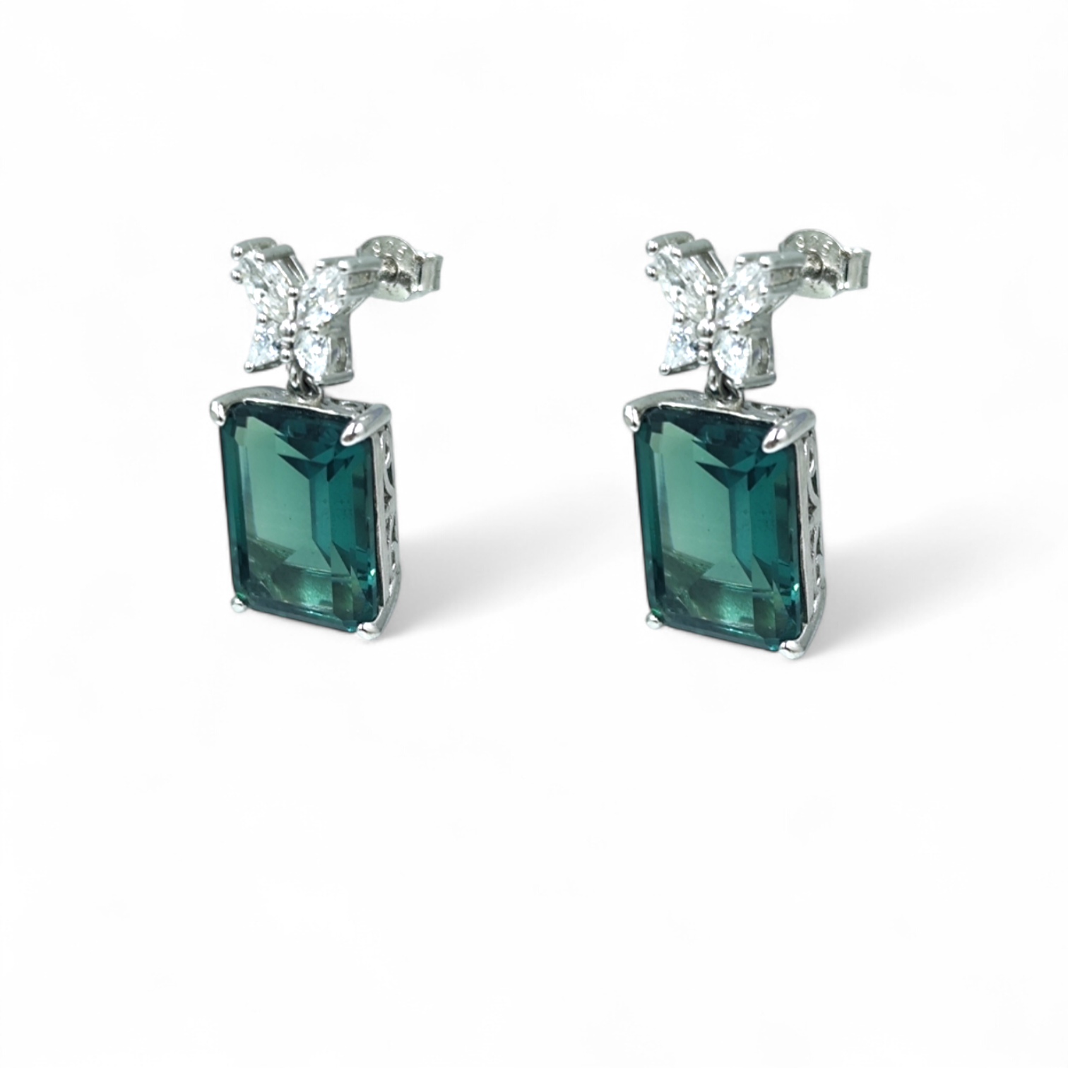 Κρεμαστά, σκουλαρίκια στολισμένα με ζιργκόν σε london blue χρώμα σε ορθογώνιο σχήμα και πεταλούδες με λευκές πέτρες, από ασήμι 925°. Ιδανικό κόσμημα για εντυπωσιακές εμφανίσεις.