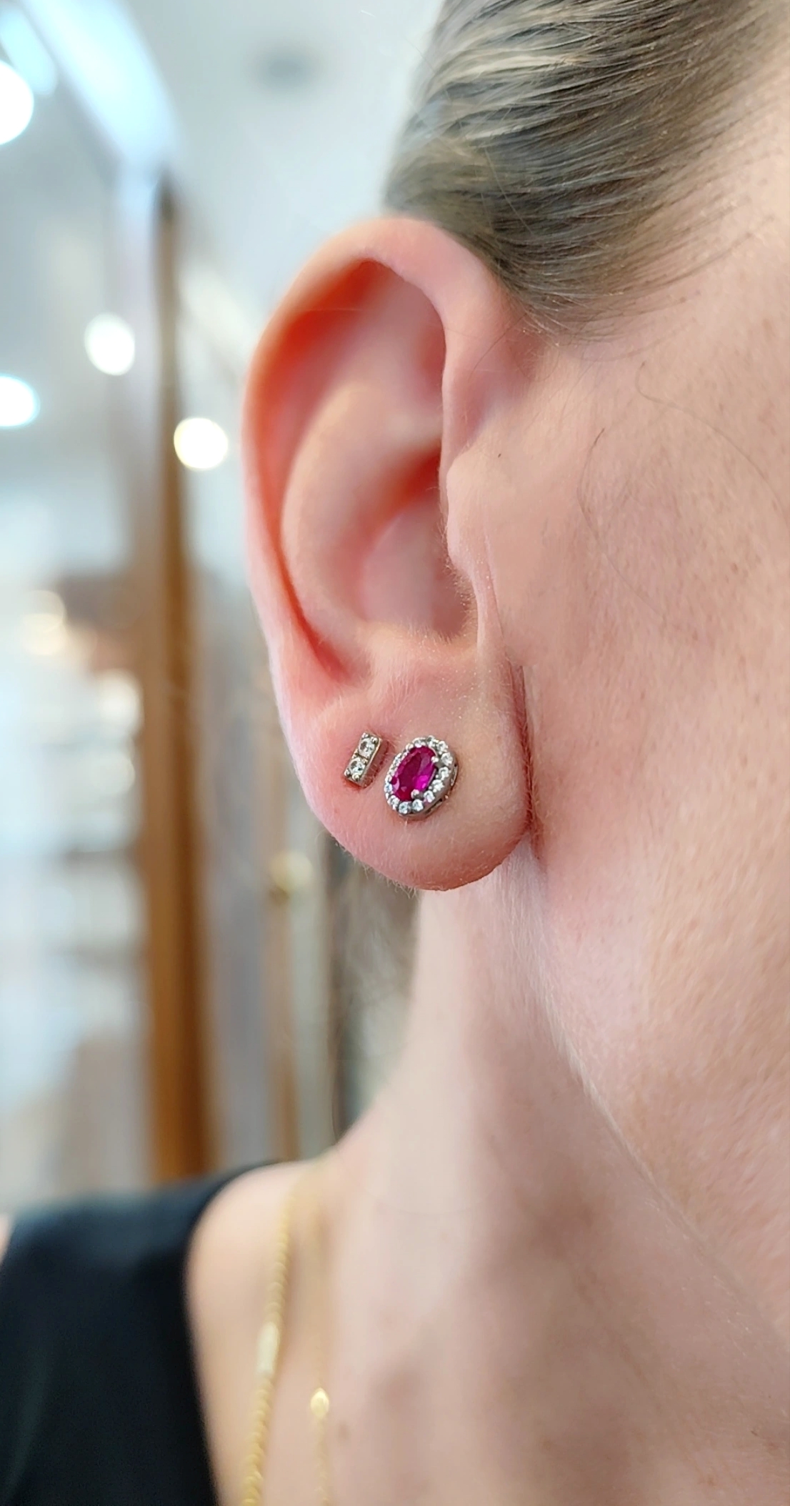 Κολλητά σκουλαρίκια από ασήμι 925° σε σχήμα ροζέτας με λευκά ζιργκόν και κόκκινη πέτρα στο κέντρο.