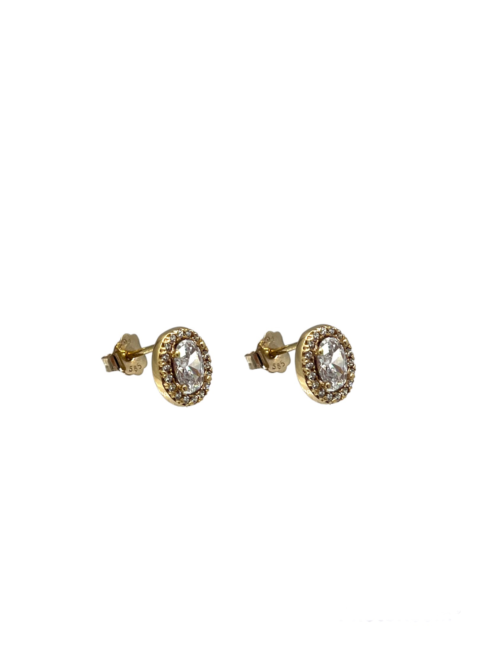 Χρυσά σκουλαρίκια 14 καράτια με λευκή κεντρική πέτρα και λευκά ζιργκόν περιμετρικά σε οβάλ σχήμα, ένα κόσμημα που θα σας συνοδεύει καθημερινά για ξεχωριστές εμφανίσεις.