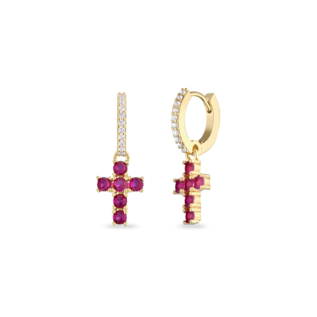 Σκουλαρίκια κρίκοι με λευκές πέτρες ζιργκόν από ασήμι 925°, το κρεμαστό μέρος αποτελείται από σταυρό με κόκκινες πέτρες.