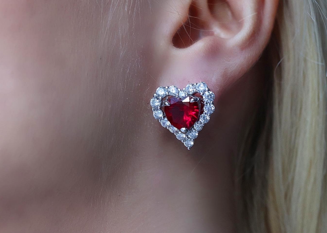 Σκουλαρίκια σε σχήμα καρδιάς με λευκές πέτρες ζιργκόν περιμετρικά και κόκκνινα ζιργκόν στο κέντρο από ασήμι 925° ,ιδανικό κόσμημα για εντυπωσιακές εμφανίσεις.