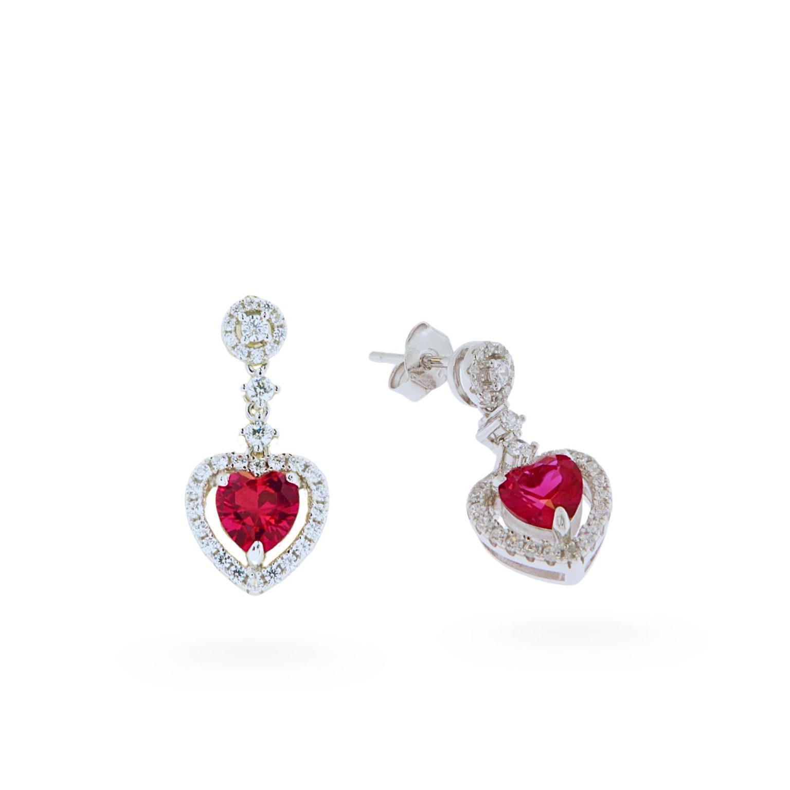 Σκουλαρίκια  κρεμαστά με λευκά ζιργκόν και κεντρική κόκκινη πέτρα,σε σχήμα καρδιάς από ασήμι 925°.