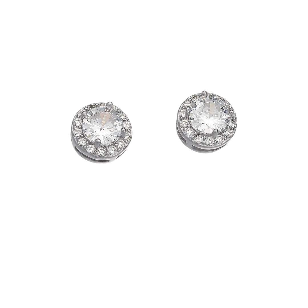 Σκουλαρίκια σε στρογγυλό σχήμα ροζέτας με λευκά ζιργκόν και λευκή κεντρική πέτρα από ασήμι 925°. Ένα κόσμημα που θα σας συνοδεύει καθημερινά.