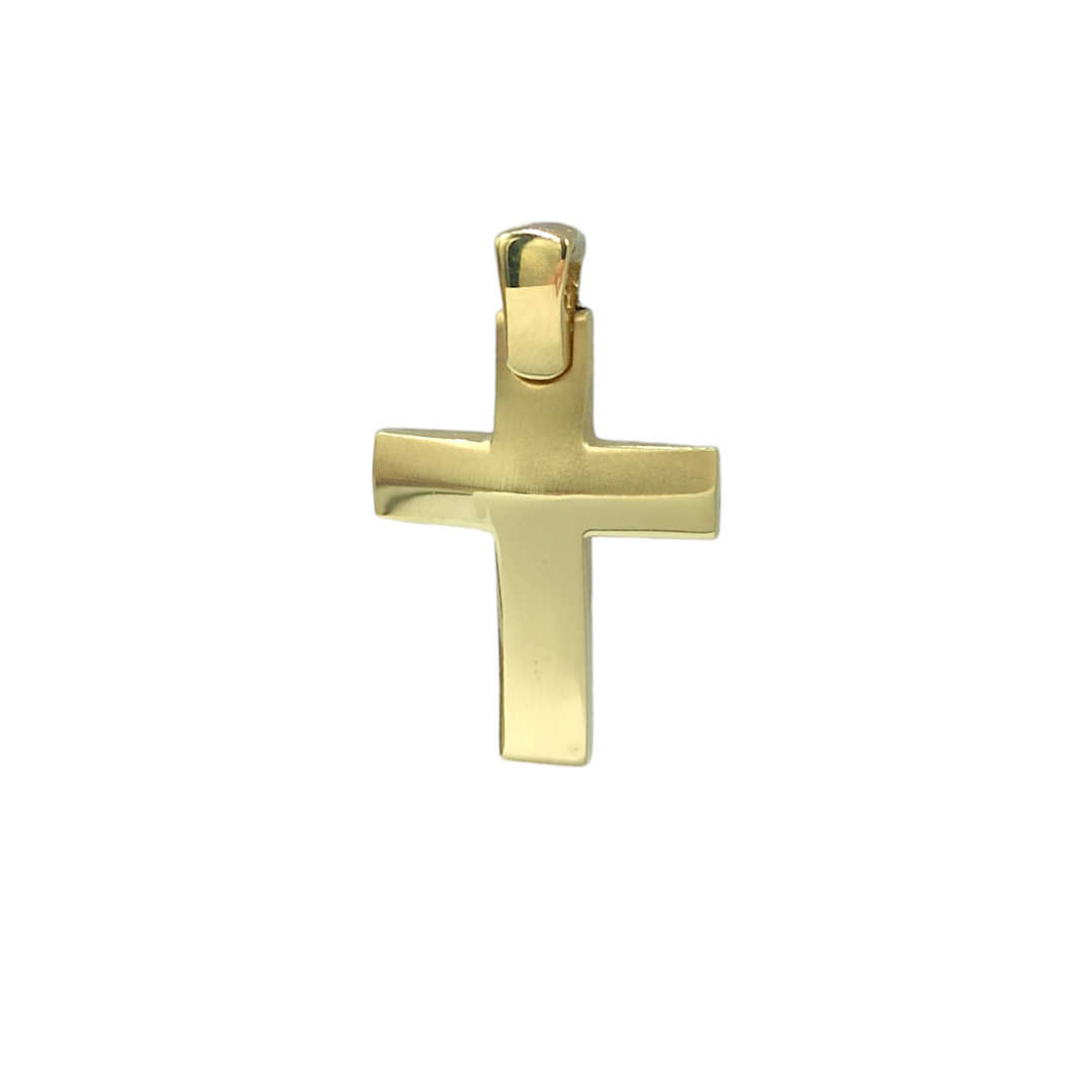 Σταυρός σε 14 καράτια χρυσός σε λιτό ύφος με λουστρέ και ματ φινίρισμα στο μπροστινό μέρος, ιδανικός για βάφτιση και ανδρικό κόσμημα.