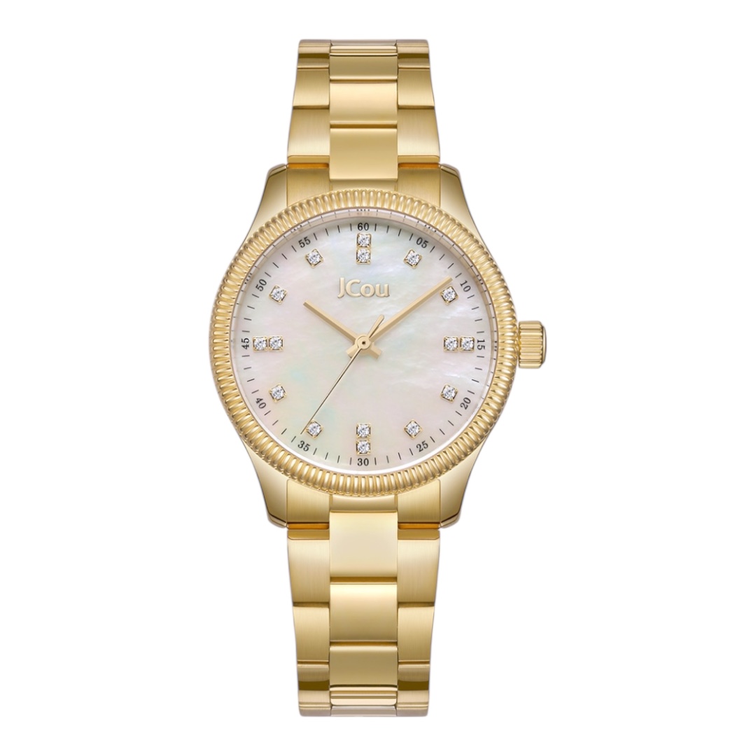 Γυναικείο κομψό αδιάβροχο ρολόι της JCou Esperia ju19077-5 με καντράν λευκό, ατσάλινο χρυσό μπρασελέ και λευκές πέτρες στο καντράν.