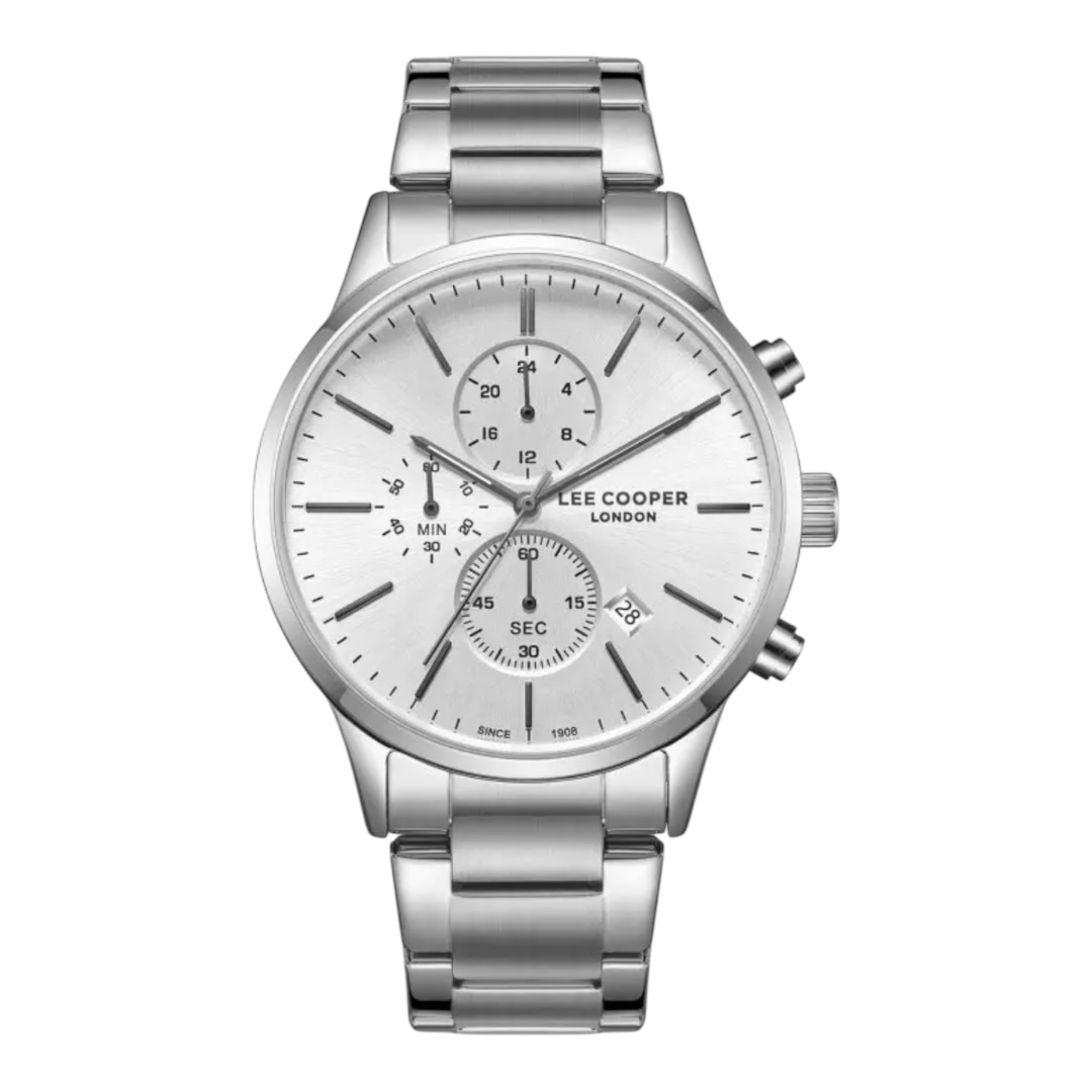 Ανδρικό ρολόι Lee Cooper με λευκό καντράν και ασημένιες λεπτομέρειες η κάσα του οποίου είναι κατασκευασμένη από ένα πολύ ανθεκτικό κράμα μετάλλων τετραπλής επίστρωσης που ονομάζεται Supermetal και μπρασελέ  μεταλλικό ,ένα πολύ κομψό ανδρικό ρολόι.
